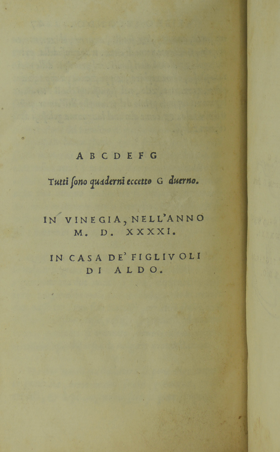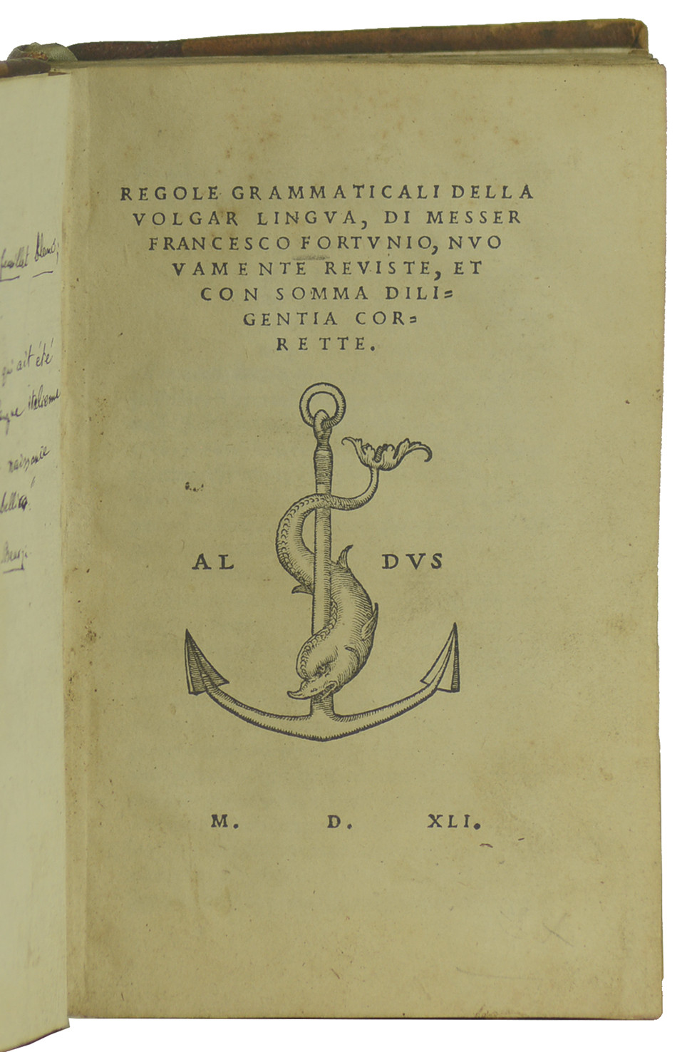 Renouard, p. 122, n° 2 ; Brunet, II, 1352 ; BL, 275 (2 exemplaires) ; Ascarelli-Menato, p. 325-326. Première édition aldine de cette importante grammaire de l’italien, établie sur les usages des trois grands auteurs Dante, Pétrarque et Boccace. Les deux premiers livres des Regole de Fortunio avaient été publiés pour la première fois en 1516 (Ancône, Bernardino Vercellese). L’ouvrage connut un grand succès et fut l’objet d’une vingtaine d’éditions au cours du siècle. Les Alde l’imprimèrent une première fois en 1541, puis en 1545 et en 1552, et Francesco Sansovino l’inséra dans son recueil des grands textes grammaticaux (voir Le osservazioni della lingua volgare di diversi uomini illustri, Venise, Fr. Rampazetto, 1565). Ce premier traité de grammaire italienne est appelé vulgaire au XVIe siècle par opposition à la grammaire dite cultivée ou au latin. Un ensemble de 49 feuillets blancs a été ajouté à la fin du texte pour que l'épaisseur de la reliure corresponde au volume. Marque de l'ancre aldine au titre et au verso du dernier feuillet.