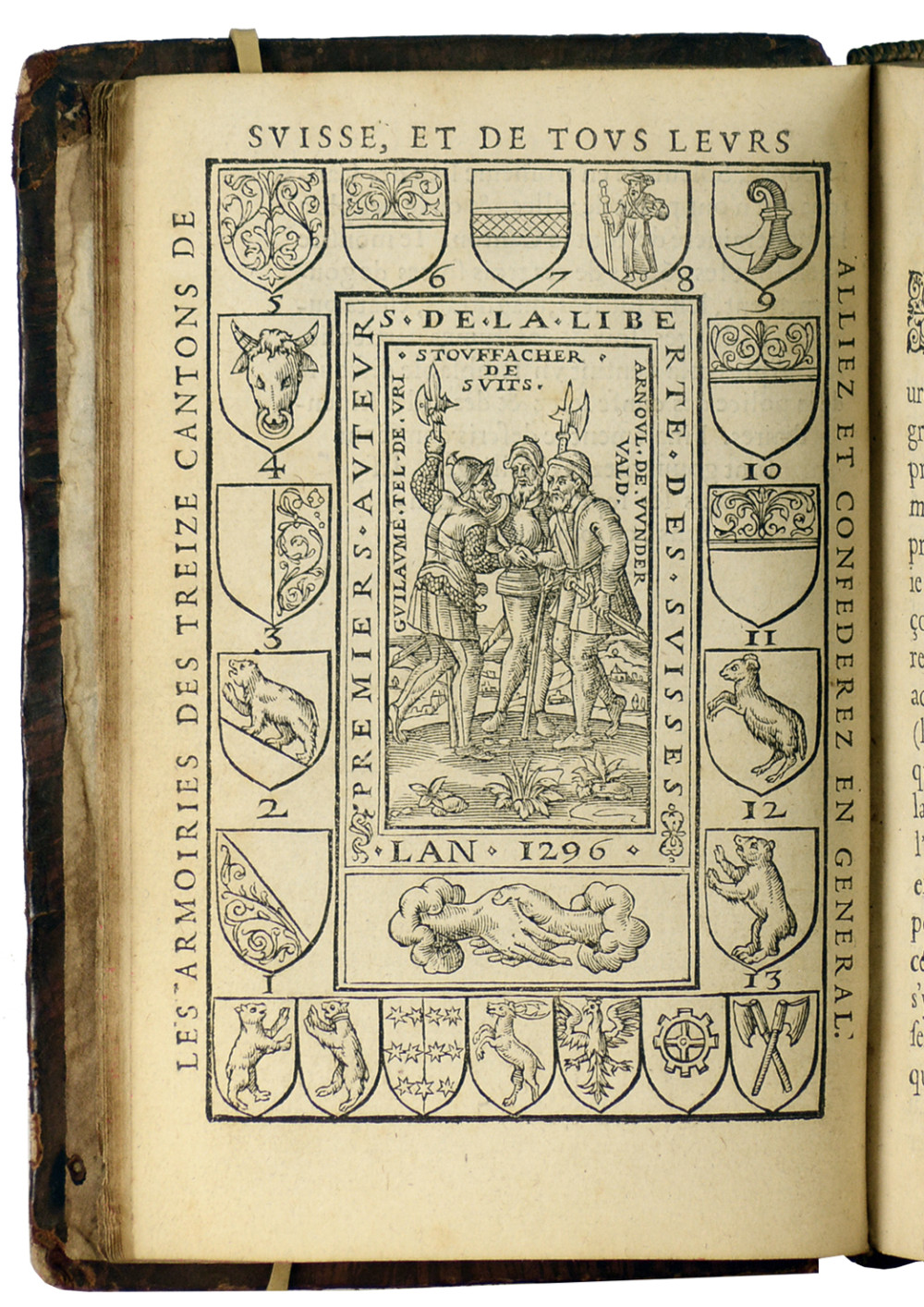 Adams, S 1169. Brun, 295. Seconde édition de la traduction française du De Republica helvetiorum (1576) du savant zurichois Josias Simler. La traduction est communément attribuée à Innocent Gentilet et fut imprimée pour la première fois en 1577 à Genève. Ouvrage illustré d'une planche d'armoiries encadrant une représentation du serment du Grütli, hors-texte, et de 13 grandes vignettes gravées sur bois dans le texte représentant les vues des grandes villes suisses : Lucerne, Zurich, Glaris, Zug, Berne, Fribourg, Soleure, Bâle, Schaffouse, Appenzell, Uri, Unterwald. Théologien et géographe suisse Josias Simler (1530- 1576), a enseigné l'exégèse biblique à Zurich. "Son traité historico-gouvernemental sur la Suisse (publié pour la première fois en latin en 1576), avec lequel (il) a contré les préjugés monarchistes contre la Suisse républicaine, a façonné la vision de la Confédération suisse parmi les peuples instruits d'Europe jusqu'au 18e siècle" (H. U. Bächtold dans NDB 24, 420/421). Ouvrage rogné court en tête. Ex-libris au timbre humide et annotation ancienne sur la page de titre.