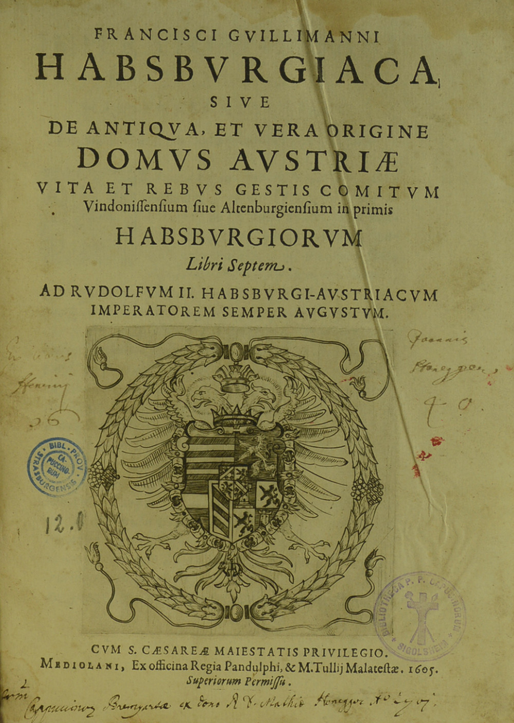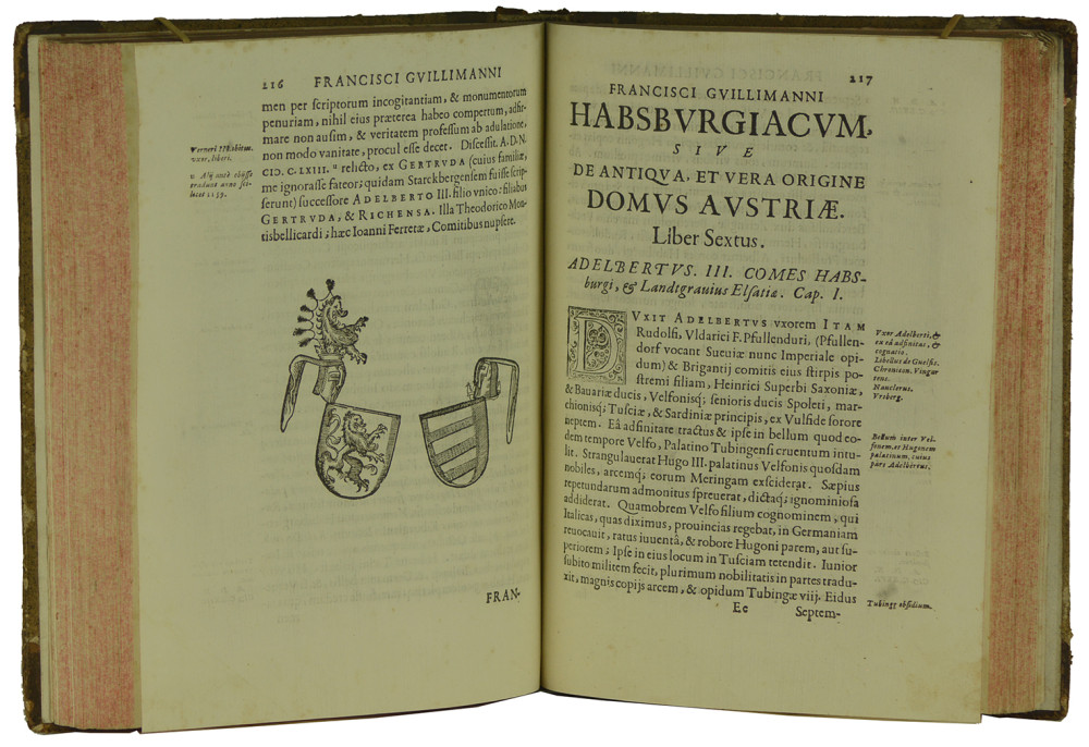Édition originale de cette histoire des Habsbourg, illustrée de 23 gravures sur bois dans le texte, représentant blasons et armoiries. Armes des Habsbourg gravées sur cuivre sur la page de titre, qui comporte également deux cachets de bibliothèques de couvent et un ex-libris manuscrit ancien. Petits défauts. Rare.