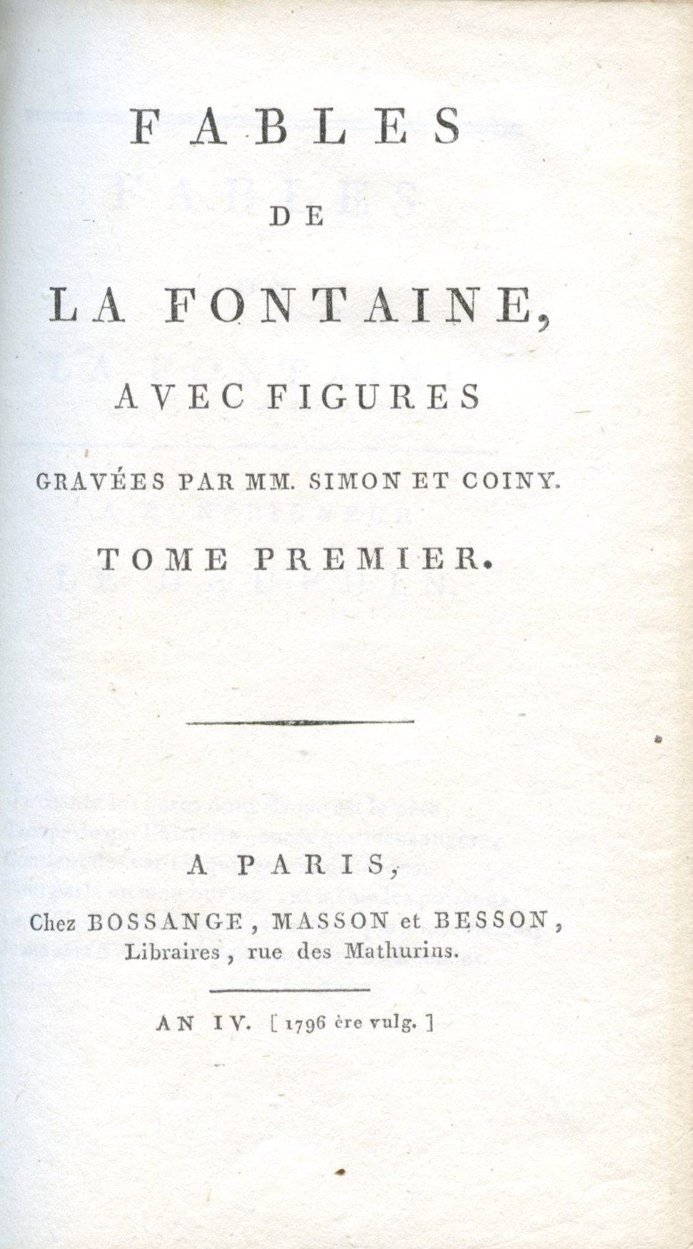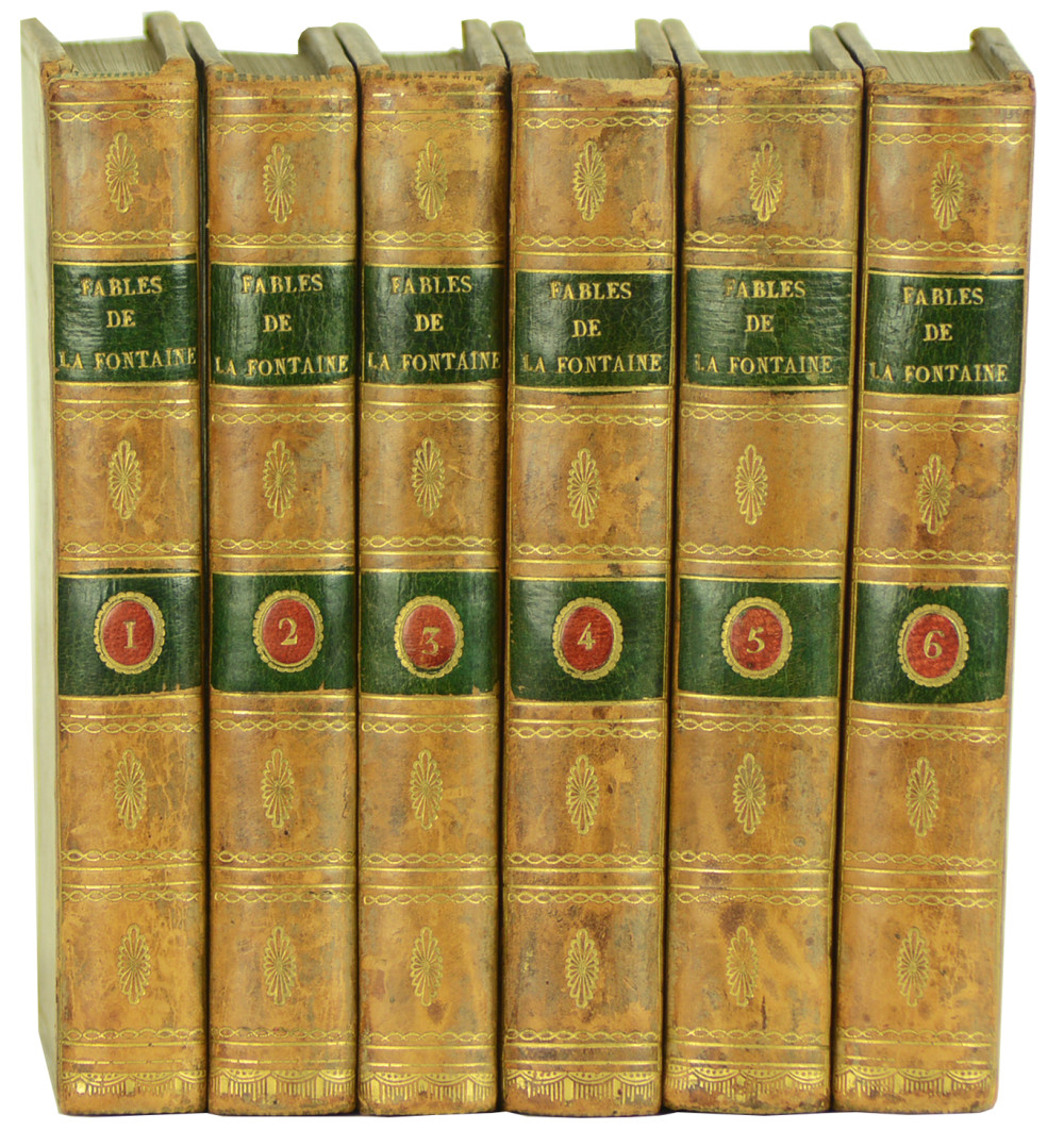 Rochambeau, Bibliographie des oeuvres de La Fontaine, p. 54, n° 146. Édition imprimée par Crapelet, copiée sur celle donnée par Didot en 1787, illustrée de 276 planches protégées par des serpentes, dont une en frontispice, gravées par Simon et Coiny d'après Vivier, premier peintre de S.A. Monseigneur le Prince de Bourbon. Impression sur un beau papier vélin, agréables reliures de style néo-classique. Ex-libris au timbre humide rouge au verso des feuillets de garde, bon exemplaire malgré les petits défauts signalés aux reliures.