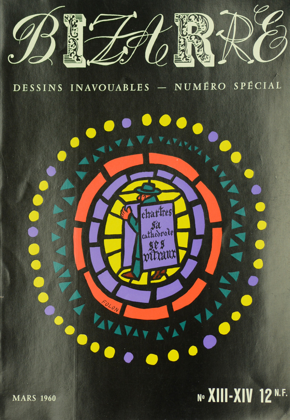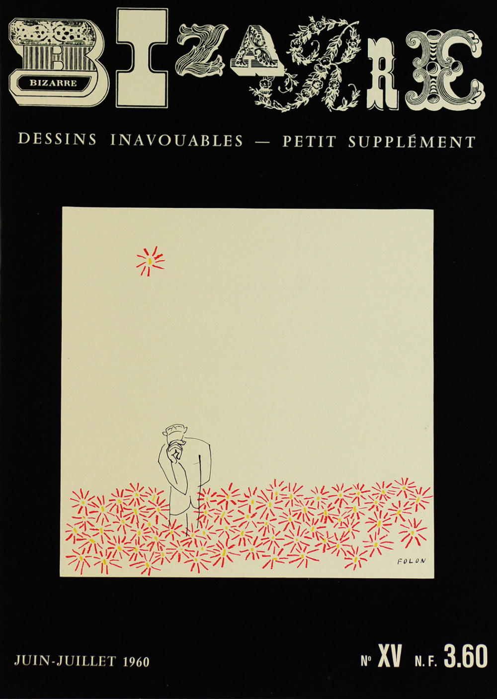 Copieux numéro de Bizarre entièrement consacré aux dessins inavouables d'Ami, Bosc, Chaval, Claude, Colos, Gabriel Edme, Folon, André François, Gébé, Maurice Henry, Lob, Maki, Morez, Mose, Ru, Siné, Tetsu, Trez, Topor et de Guy Valls. On joint le numéro suivant de la revue comprenant quelques dessins inavouables supplémentaires de Hans Beck, Laville, Gino Ricca, Solo, Ylipe, Zar et Folon. Bon ensemble.