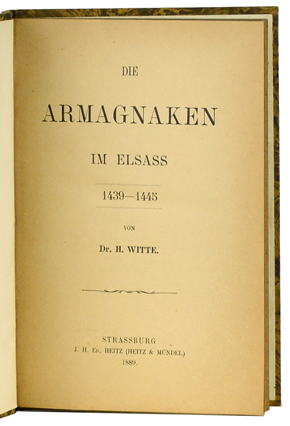 Édition originale de cette étude concernant l’intervention des troupes armagnacques en Alsace entre 1439 et 1445, période marquée par la rivalité entre Armagnacs et Bourguignons. Witte analyse comment ces mercenaires, alliés aux villes alsaciennes (comme Strasbourg) et aux Confédérés suisses, ont joué un rôle clé dans les conflits locaux, notamment lors de la guerre de Dachsberg et de la bataille de Saint-Jacques-sur-la-Lys (1445). Bon exemplaire, agréablement relié.