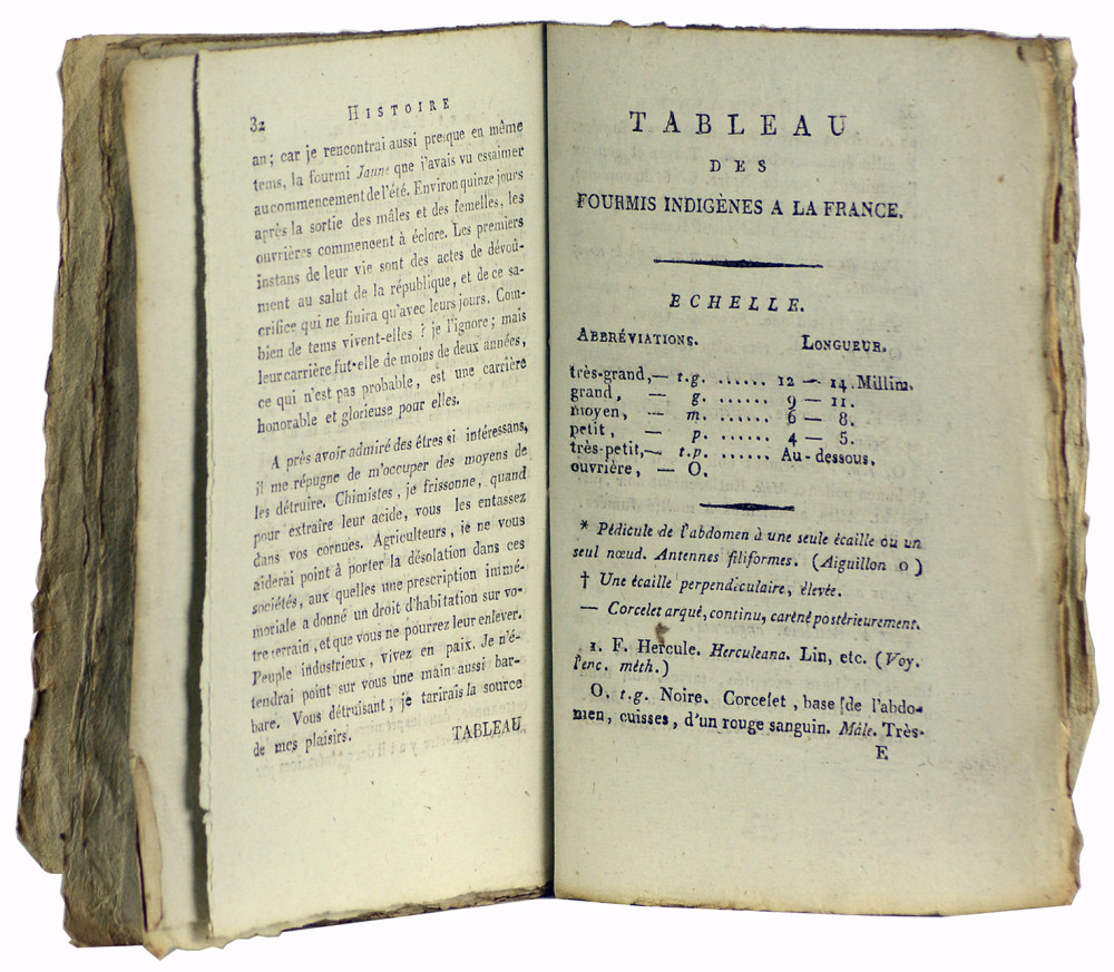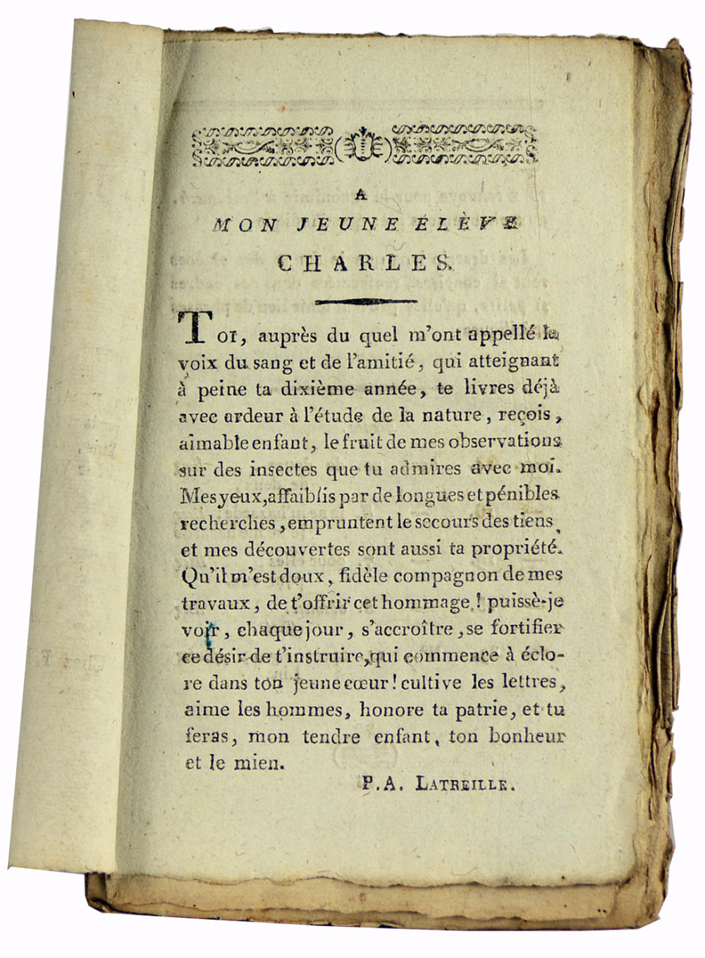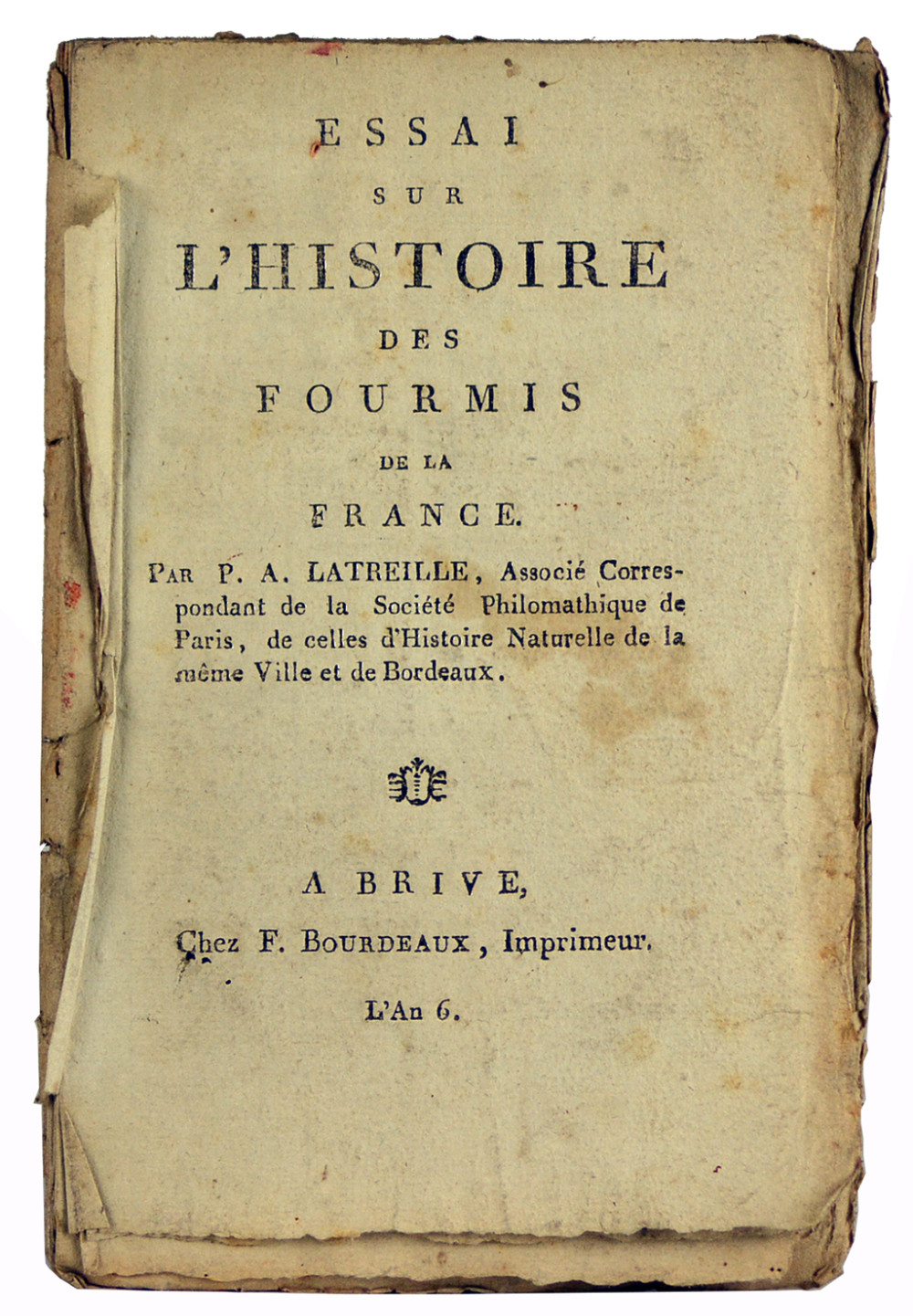 Édition originale rare. Pierre-André Latreille (1762–1833), né à Brive (Corrèze), est issu d’un milieu modeste. Il étudie au collège de la ville, où il se passionne très tôt pour l’histoire naturelle, notamment les insectes. Son éducation est marquée par la rencontre avec des naturalistes locaux et des prêtres érudits, qui l’initient à l’observation méthodique de la nature. En 1780, il entre au séminaire de Limoges, puis est ordonné prêtre en 1786. De retour à Brive, Latreille enseigne et poursuit ses études naturalistes. Il se consacre à l’entomologie, collectant et décrivant des spécimens dans la région. Ses observations, souvent menées en collaboration avec des correspondants scientifiques, jettent les bases de ses futures classifications. En 1793, la Révolution bouleverse sa vie : arrêté pour avoir refusé de prêter serment à la Constitution civile du clergé, il est emprisonné, puis condamné à la déportation en Guyane. Grâce à ses connaissances en entomologie, il est finalement libéré en 1795 après avoir attiré l’attention de naturalistes influents. Il deviendra « aide-naturaliste » auprès de Lamarck au Muséum national d’Histoire naturelle. Son "Essai sur l'histoire des fourmis de la France" constitue une sorte de préambule à son œuvre majeure, l' Histoire naturelle des fourmis (1802). La brochure s'ouvre sur cette touchante dédicace imprimée à son jeune élève Charles (Latreille fut le précepteur, durant les années qu’il passa à Brive, vers 1795-1798, d'un fils de notable, qui fut son élève préféré) : "Toi, auprès du quel m'ont appelé la voix du sang et de l'amitié, qui atteignant à peine ta dixième année, te livre déjà avec ardeur à l'étude de la nature, reçois, aimable enfant, le fruit de mes observations sur des insectes que tu observes avec moi. Mes yeux, affaiblis par de longues et pénibles recherches, empruntent le secours des tiens et mes découvertes sont aussi ta propriété. Qu'il m'est doux, fidèle compagnon de mes travaux, de t'offrir cet hommage ! Puissè-je voir, chaque jour, s'accroître, se fortifier ce désir de t'instruire, qui commence à éclore dans ton jeune cœur ! Cultive les lettres, aime les hommes, honore ta patrie, et tu feras, mon tendre enfant, ton bonheur et le mien". Page de titre un peu poussiéreuse comportant quelques rousseurs, en raison de l'absence du plat supérieur de la couverture, sinon bon exemplaire tel que paru, non rogné.