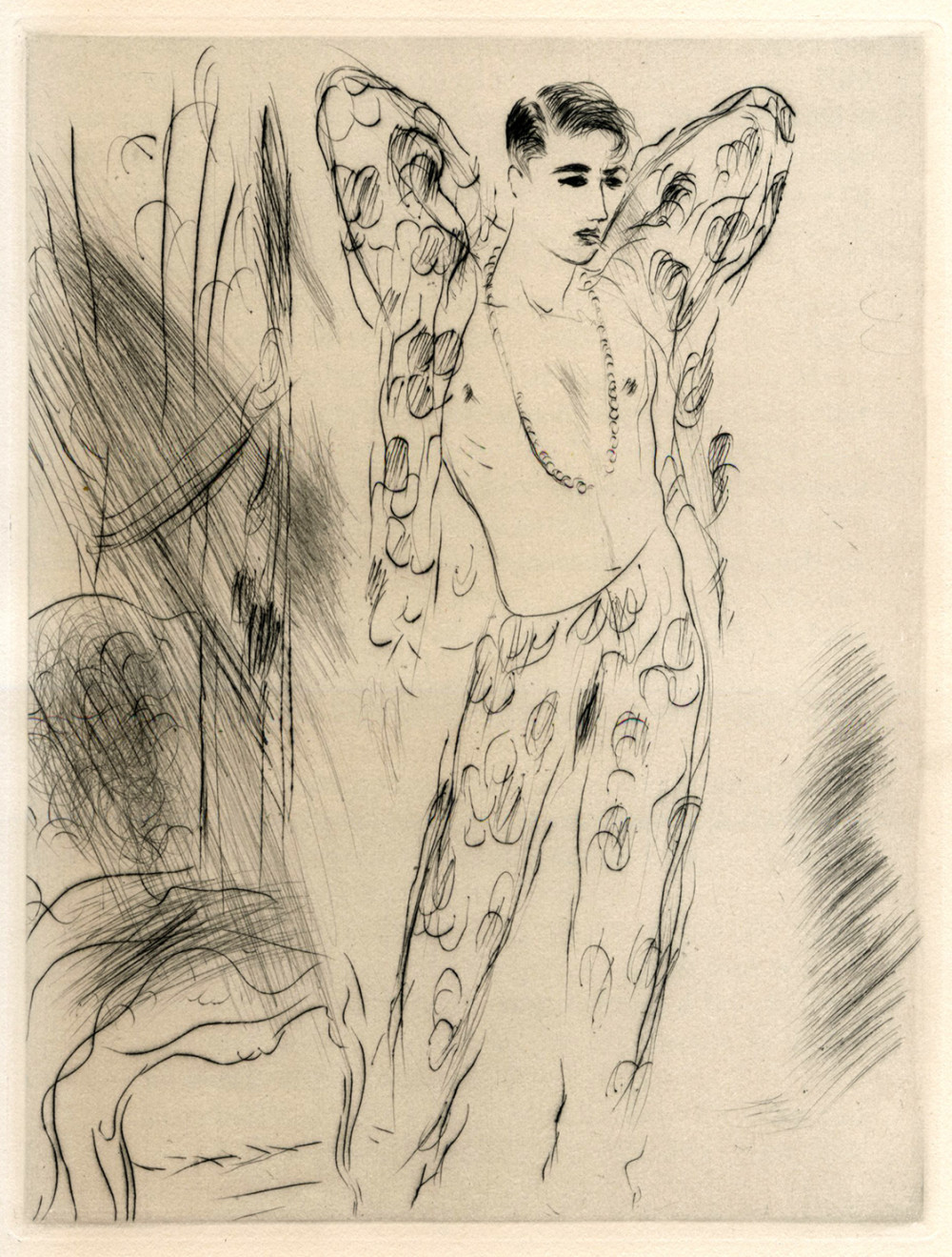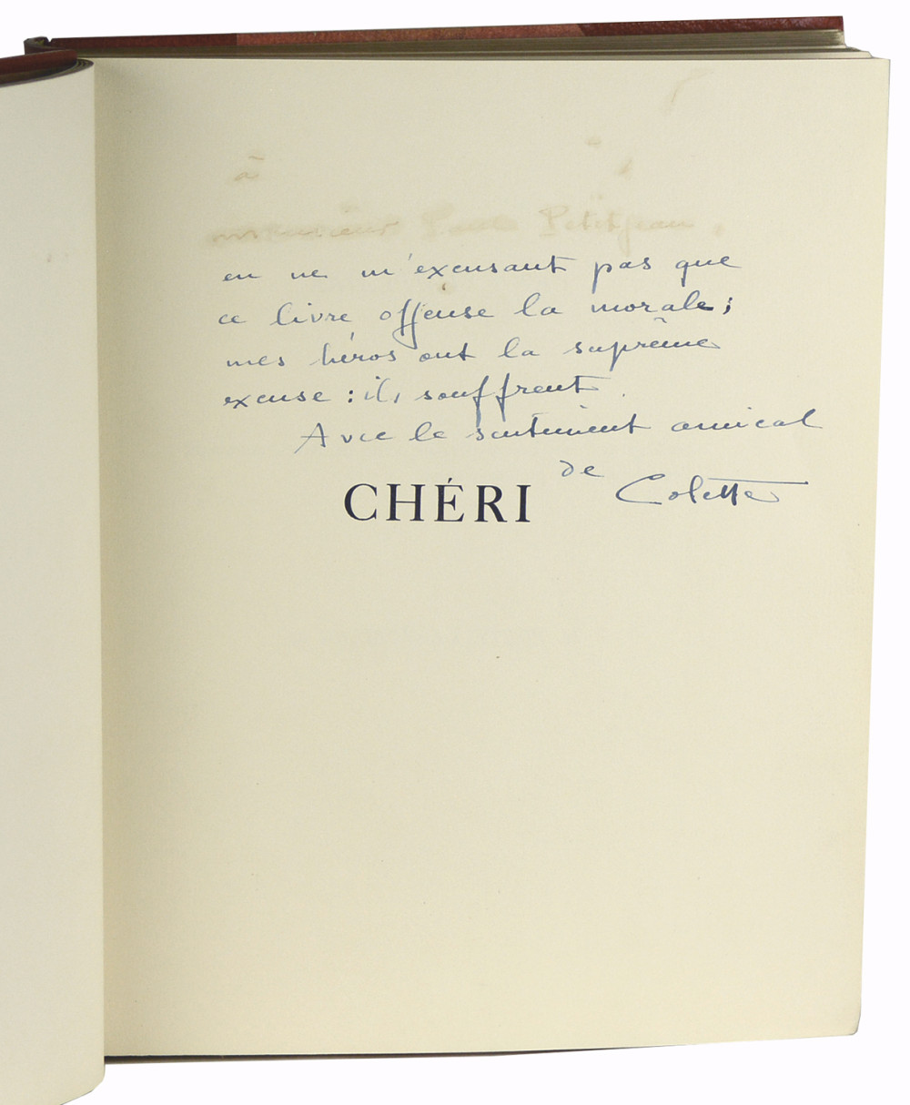 Carteret IV, 108. Édition de luxe dont le tirage a été limité à 156 exemplaires, ici l'un des 100 numérotés sur vélin de Rives, contenant l'état définitif des pointes-sèches. Avec ce bel envoi autographe signé de Colette : "[à] [nom du dédicataire effacé] en ne m'excusant pas que ce livre offense la morale ; mes héros ont la suprême excuse : ils souffrent. Avec le sentiment amical de Colette". Bel exemplaire, bien établi par Georges Cretté.