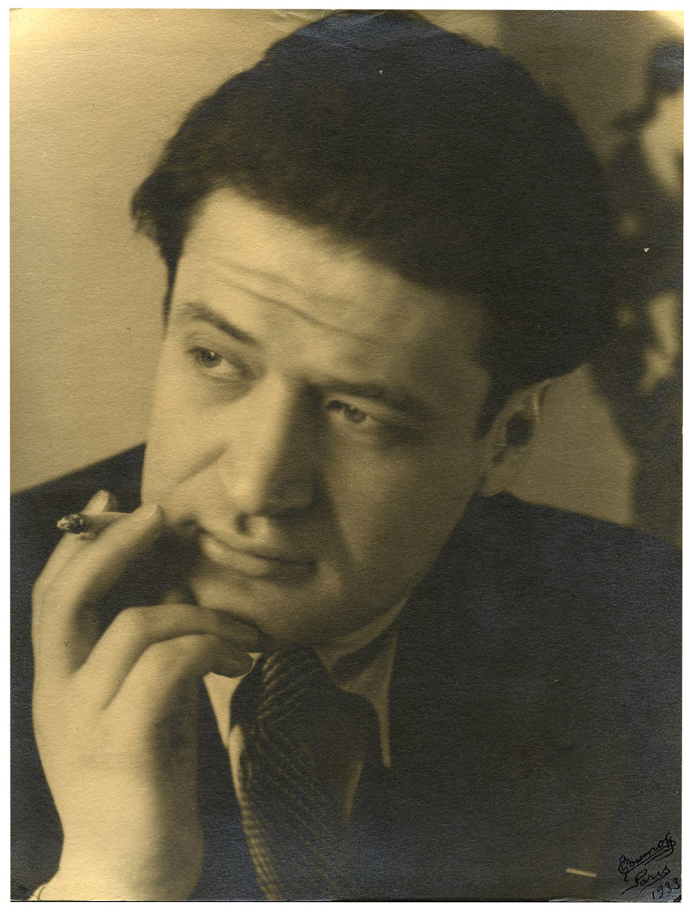 Très rare et beau portrait de l’écrivain et journaliste Joseph Kessel (1898–1979), par Pierre Choumoff (1872-1936), né à Grodno (Empire russe) et installé à Paris. Il fut l’un des photographes les plus recherchés de la diaspora russe. Son atelier de la rue d’Odessa à Montparnasse accueillit de nombreux artistes exilés — Ossip Zadkine, Marc Chagall, Serge Lifar, Léon Bakst, entre autres — ainsi que des figures du monde littéraire et artistique français. Épreuve au gélatino-bromure d'argent, signée par le photographe à Paris, datée 1933. Petits miroirs d'argent en bordure du tirage, petit manque de papier superficiel au dos du tirage, mais bel état général.