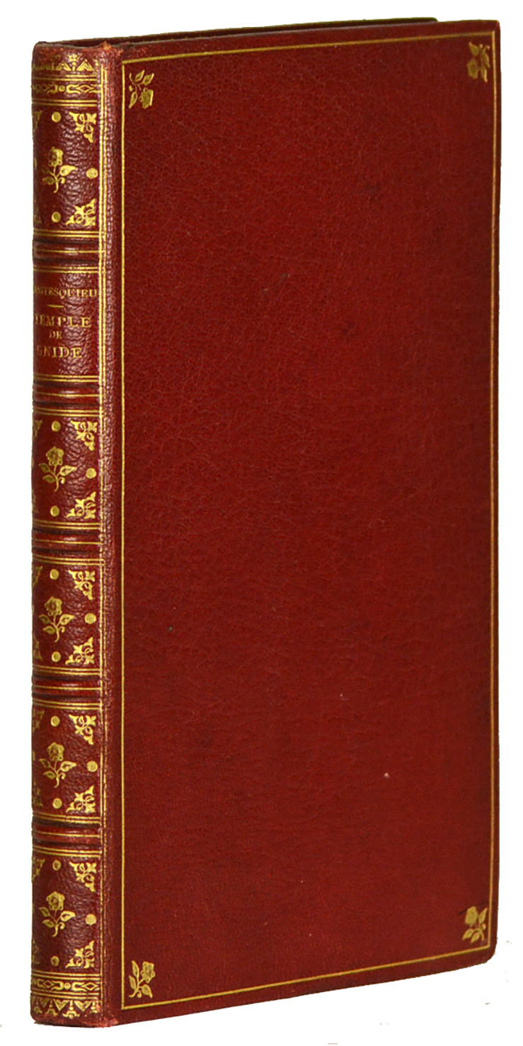 Londres [Paris], [Huart], (1742) ; petit in-8, VIII + 85 pp., maroquin rouge moderne, dos orné à nerfs, filet d'encadrement sur les plats et fleurons d'angle, tranches dorées (le relieur a ajouté, à la fin, une quarantaine de feuillets vierges).