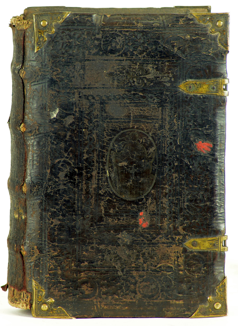 Anvers, Apud viduam et haere des Ioannis Stelsii [Jean Steelsius], 1572 ; in-8, 8 ff.n.ch. + 426 ff. + 6 ff.n.ch., plein veau sur ais de bois de l'époque, dos muet à quatre nerfs, écoinçons métalliques présents aux deux plats, reliquats de fermoirs, décor estampé à froid sur les plats, tranches rouges (reliure usée : coiffes absentes, petits manques de cuir au decond plat, laissant apparaître le bois, fermoirs absents, estampages passés, petits reliquats de cire rouge sur le plat supérieur).