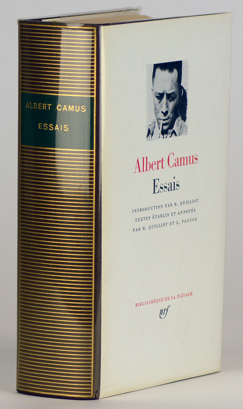 Collection Bibliothèque de la Pléiade, n° 183, retirage de 1972. Contient : L'Envers et l'Endroit - Noces - Le Mythe de Sisyphe - Lettres à un ami allemand (1943-1944) - Actuelles I, chroniques 1944-1948 - L'Homme révolté - Actuelles II, chroniques 1948-1953 - L'Été Actuelles III, chroniques algériennes 1939-1958 - Réflexions sur la guillotine - Discours de Suède (1957) - Essais critiques - Introduction aux « Maximes » de Chamfort - Avant-propos à « La Maison du peuple », de Louis Guilloux - Rencontres avec André Gide - L'Artiste en prison - Roger Martin du Gard - Sur « Les Îles », de Jean Grenier - René Char - Appendices : Métaphysique chrétienne et néoplatonisme. Articles, préfaces, interviews, inédits. Bon exemplaire.