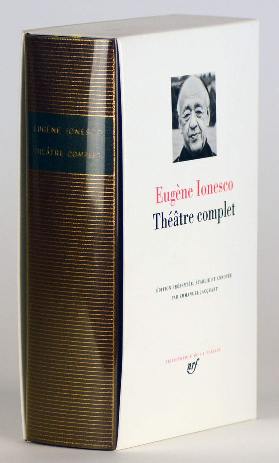 Collection Bibliothèque de la Pléiade, n° 372, retirage de 2007. Contient : La Cantatrice chauve - La Leçon - Les Salutations - Jacques ou la soumission - L'Avenir est dans les œufs - Les Chaises - Le Maître - Le Salon de l'automobile - Victimes du devoir - La Jeune fille à marier - Amédée ou comment s'en débarrasser - Le Nouveau locataire - Scène à quatre - Le Tableau - L'Impromptu de l'Alma - Tueur sans gages - Rhinocéros - Délire à deux - Le Piéton de l'air - Le Roi se meurt - La Soif et la faim - La Lacune - Exercices de conversation et de diction françaises pour étudiants américains - Jeux de massacre - Macbett - Ce formidable bordel ! L'Homme aux valises - Voyages chez les morts - Pièces inédites - La Nièce-Épouse - Le Vicomte - Documents. Contient également "De la mise en scène à la mise en pages" de Massin, avec des photographies d'Henry Cohen. Bel exemplaire, comme neuf.