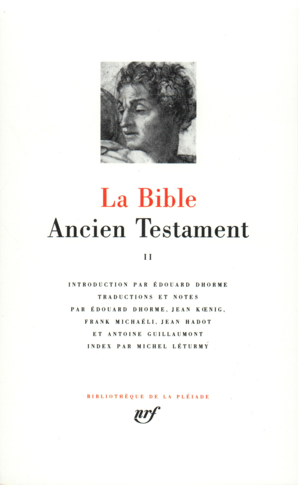 Collection Bibliothèque de la Pléiade, n° 120 & 139, retirages de 2003 et 2006. Le tome I contient : La Loi ou le Pentateuque - Livres historiques. Le tome II contient : Les Quatre grands prophètes - Les Douze petits prophètes - Les Trois livres poétiques- Les Cinq rouleaux - Les Deutérocanoniques. Traductions de l'hébreu par Édouard Dhorme, Antoine Guillaumont, Jean Hadot, Jean Koenig et Frank Michaéli. Beaux exemplaires, comme neufs.