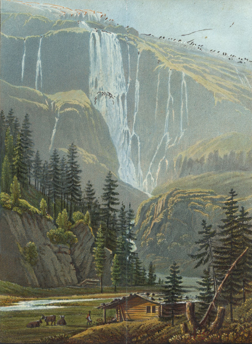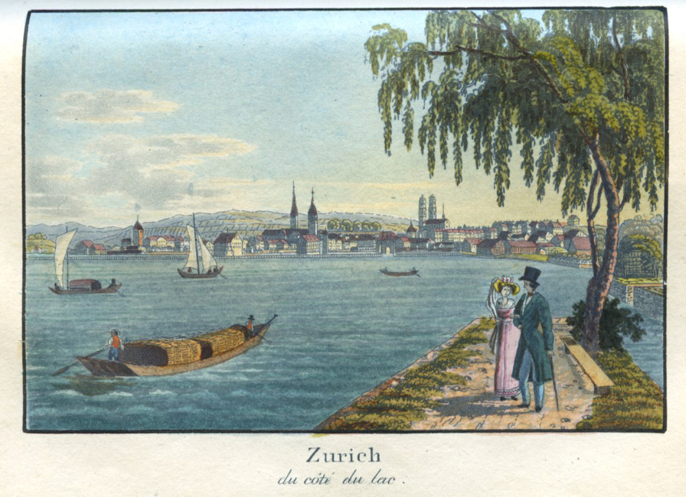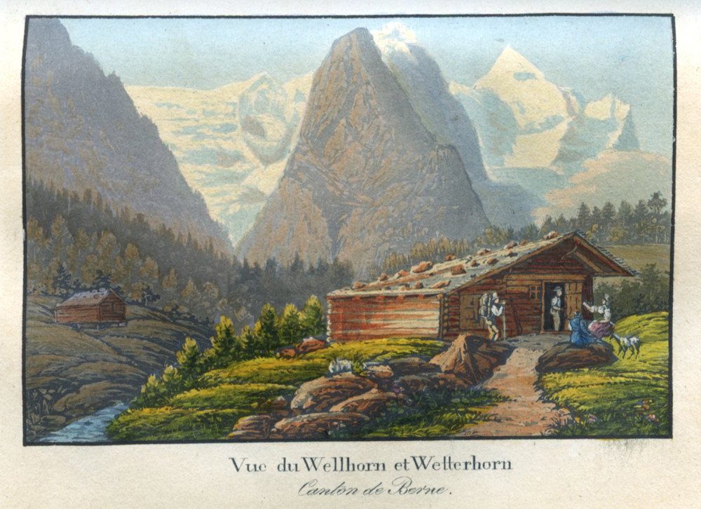 Troisième édition de ce recueil de chants traditionnels et populaires suisses. Exemplaire particulièrement intéressant enrichi d'un frontispice sur double page et de 16 aquatintes coloriées et gommées : le Schmadribach (par Bixmann) - vue d'Unterseen - vue d'Unterseen vers le lac de Thoune, Canton de Berne (par Meyer) - vue de l'Église du Saint-Esprit et de la Tour du Grand Christophe à Berne - vue de l'Hotellerie au Weissenstein près de Soleure - vue de la chute du Reichenbach au Canton de Berne - scène de taverne intitulée "Berne" (par Franz Hegi) - vue du Wellhorn et du Wetterhorn, Canton de Berne - vue de la ville de Berne - vue du Marché des Poissons à Bâle - vue de la partie intérieure d'Aarau - vue prise du Freudenberg près de Saint-Gall - vue de Soleure, Capitale du Canton de même nom - vue du pèlerinage de Sainte Verene près de Soleure - vue de l'Église de la Sainte Croix près l'Hermittage près de Soleure - une autre vue du pèmerinage de Sainte Verene près de Soleure - vue d'Interlackern et de la Junfrau, Canton de Berne - vue de Zurich du côté du lac. Seules trois de ces gravures sont signées mais elles sont toutes dans le même goût et d'une finesse remarquable. Petites rousseurs éparses sur les pages de texte, bel exemplaire.