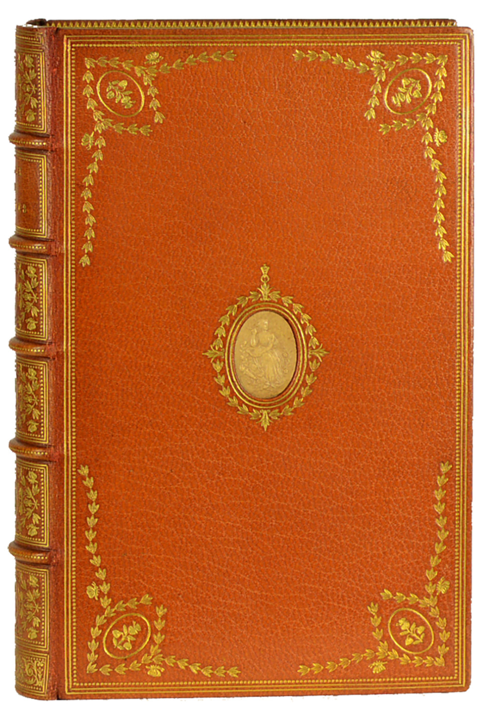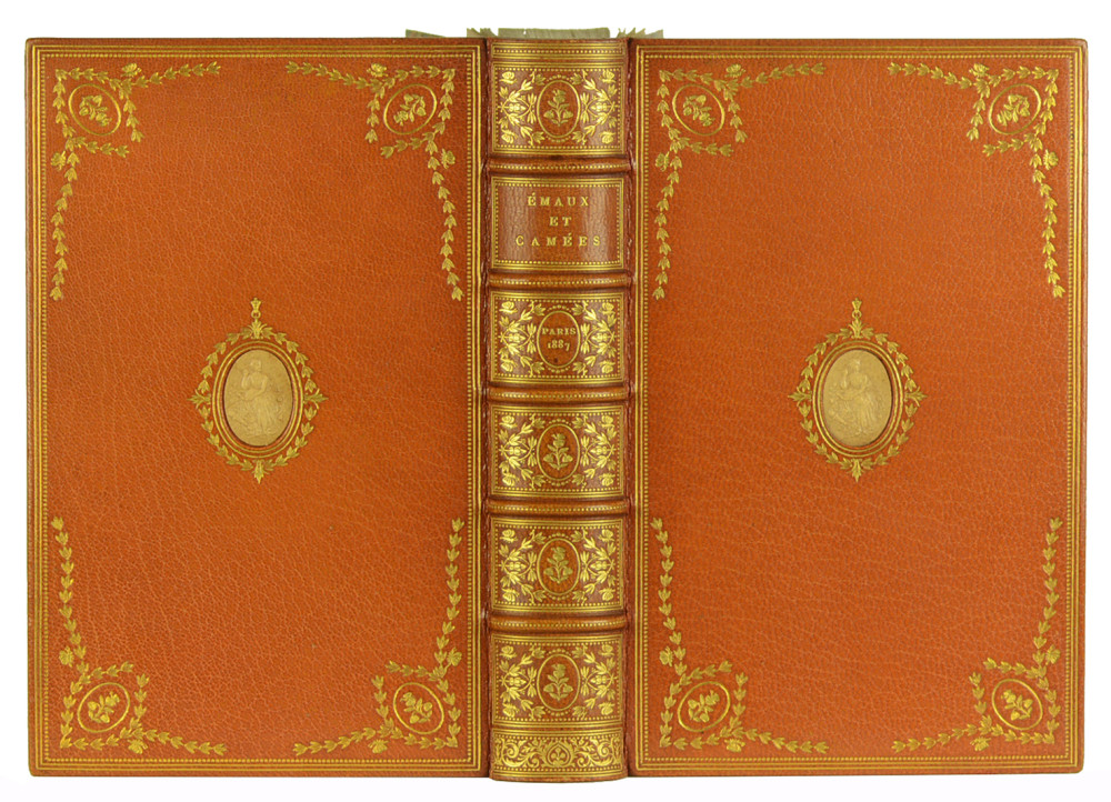 Paris, Librairie L. Conquet, 1887 ; in-12, XVI + 250 + 7, maroquin havane, dos à nerfs orné d'un riche décor de feuillage avec, aux centres des entre-nerfs, des médaillons ovales ornés de fleurs ; double filet et roulette d'encadrement sur les plats, écoinçons dorés aux petits fers composés de rameaux de feuillages et d'une petite fleur dorée en médaillon, camées ovales de couleur ivoire incrustés aux centres des plats, entourés d'une couronne de feuillage doré, double filet sur les coupes, dentelle intérieure, tranches dorées sur témoin (reliure signée Chambolle-Duru ; infimes épidermures aux mors).