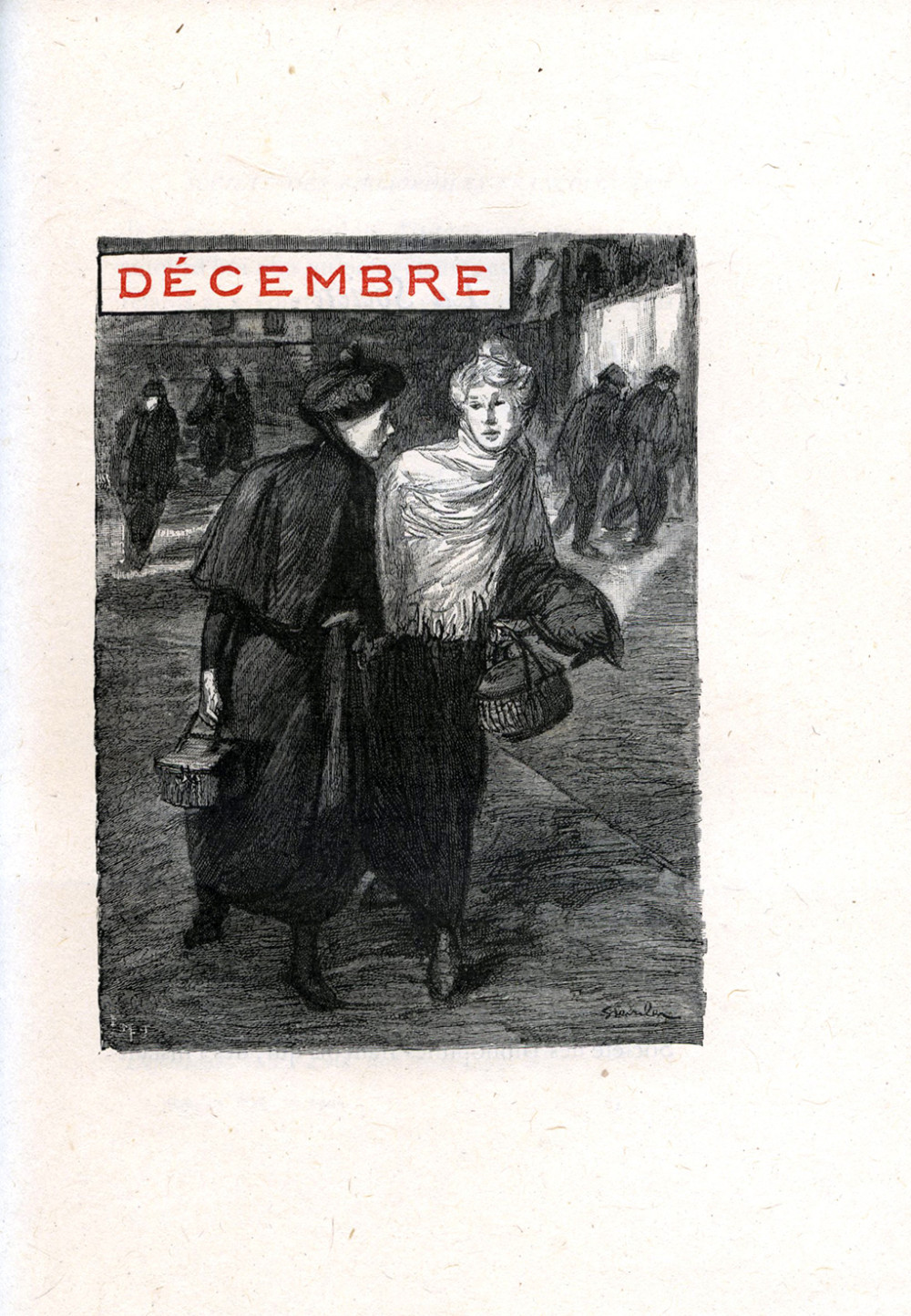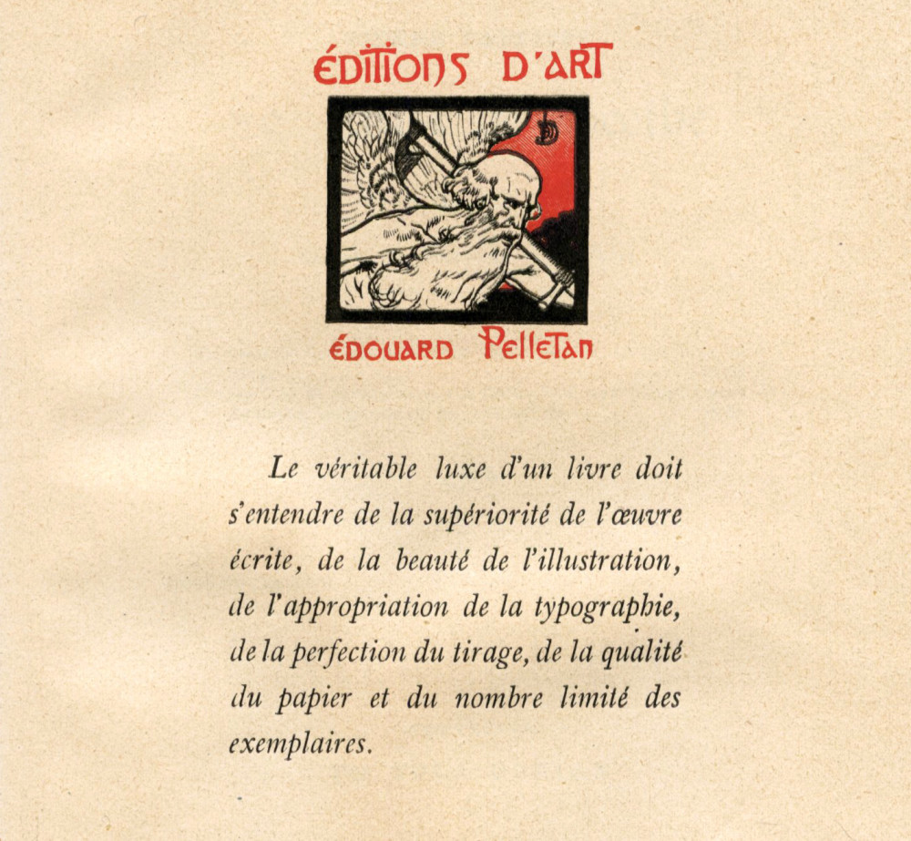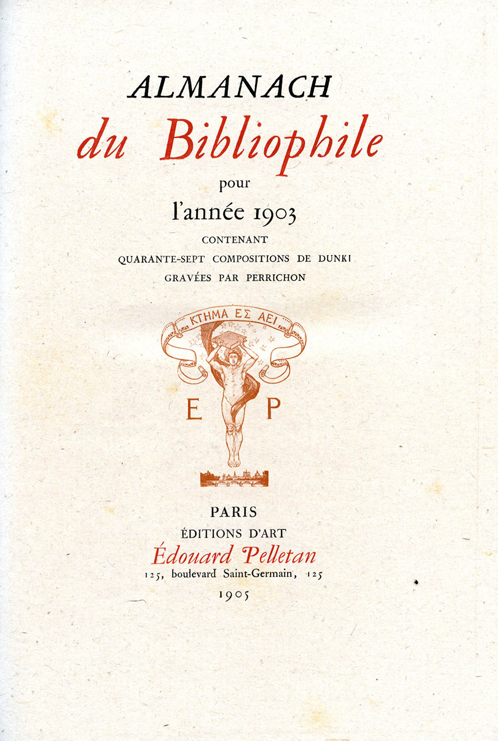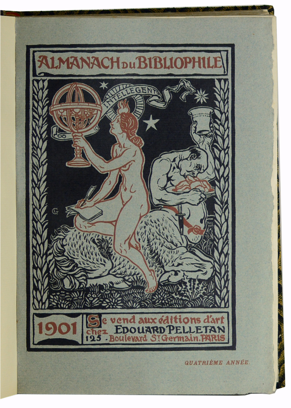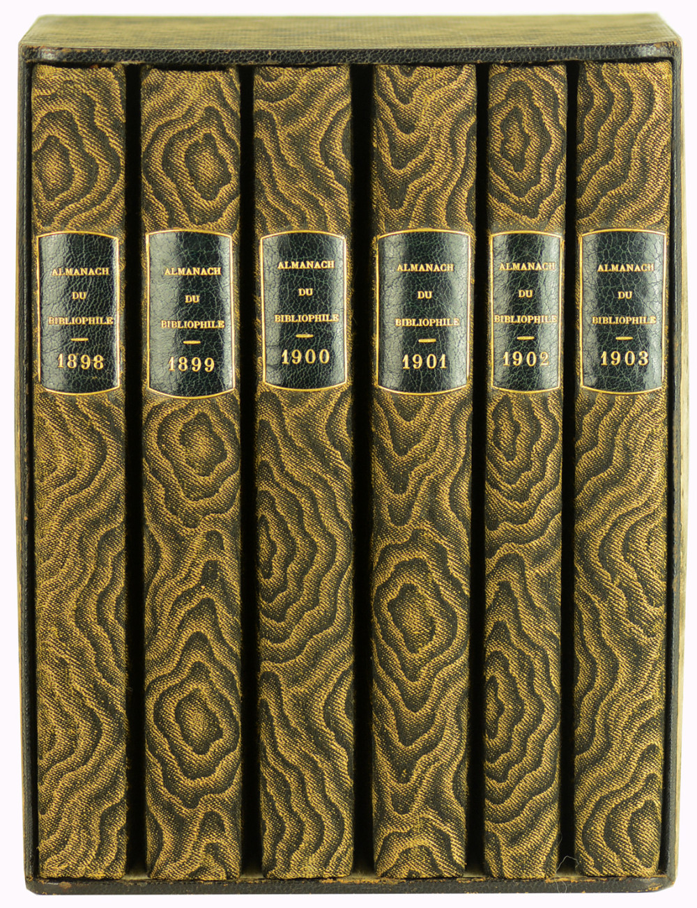 Collection complète de ce luxueux almanach, publié par Édouard Pelletan. Exemplaire du tirage de tête, un des 25 exemplaires numérotés sur chine fort, réimposés, comportant une suite des illustrations avant la lettre (seuls les 25 premiers exemplaires comportent une suite, tirée ici sur sur japon mince ou sur chine). Tous les volumes sont numérotés à la main. Pelletan confia l'illustration des almanachs, chaque année, à un artiste différent : l'année 1898 comporte 28 compositions de Henry Bellery-Fontaine, gravées par Froment ; l'année 1899 présente 38 figures dessinées et gravées par Frédéric Florian ; l'année 1900 renferme 31 illustrations de Théophile Alexandre Steinlen, gravées par Froment père et fils ; Eugène Grasset donna 30 compositions pour l'année 1901, gravées par Émile Froment ; 30 bois originaux de Paul Colin ornent le volume 1902 ; enfin 47 figures de Louis Dunki gravées par Léon Perrichon illustrent le dernier volume de la série. Superbe ensemble, reflet parfait de l’esthétique des Éditions d’Art Pelletan, réunissant année après année une collaboration prestigieuse d’artistes et d’illustrateurs. Chaque volume comporte compositions originales, bandeaux, culs-de-lampe, bois et figures gravées à la main. Outre son intérêt esthétique, la série est un témoignage essentiel sur la vie bibliophilique de la Belle Époque : chroniques, études littéraires et artistiques, bibliographies annotées, revues théâtrales, billets d’humeur d’amateurs illustres (Anatole France, Claretie, Béraldi, Clément-Janin, Vicaire…). Remarquable reliure, non signée, établie pour Juan Hernandez, dont l’ex-libris sur chine se trouve en tête de chaque volume. Très bel ensemble malgré quelques rousseurs éparses, à toutes marges, rare.