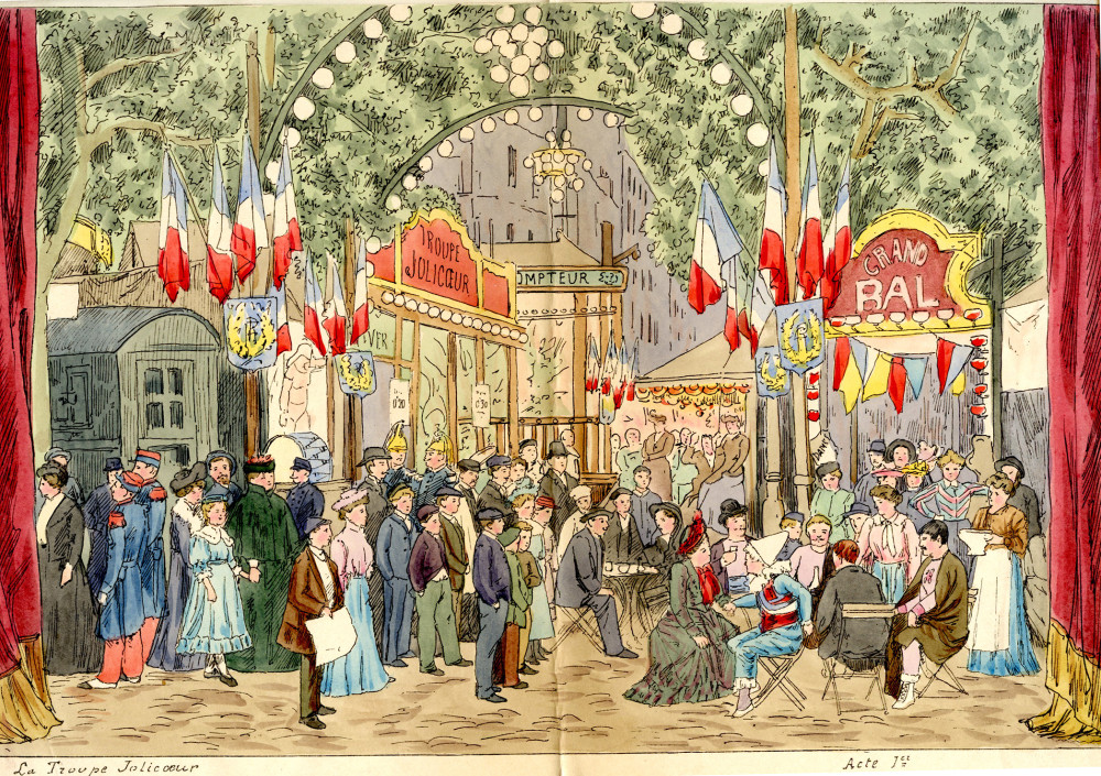 Jolie curiosité, constituée de quatre dessins originaux, à l'encre et à l'aquarelle, réalisés sur papier, puis contrecollés dans un cahier spécialement prévu à cet effet. Les dessins (20 x 30 cm environ), ne sont pas signés, malheureusement. On songe à Pierre Vidal, mais sans avoir de certitude. Projet d'illustration jamais abouti, étude sur les costumes ou les décors de la pièce ? Les quatre dessins sont, en tout cas, très aboutis, et n'ont pas trop souffert du pli central évoqué plus haut. "La troupe Jolicœur" fut représentée à l'Opéra-Comique (3e salle Favart) le 30 mai 1902. Mise en scène d'Albert Carré, décors d’Eugène Ronsin, costumes de Charles Bianchini. En l'état.
