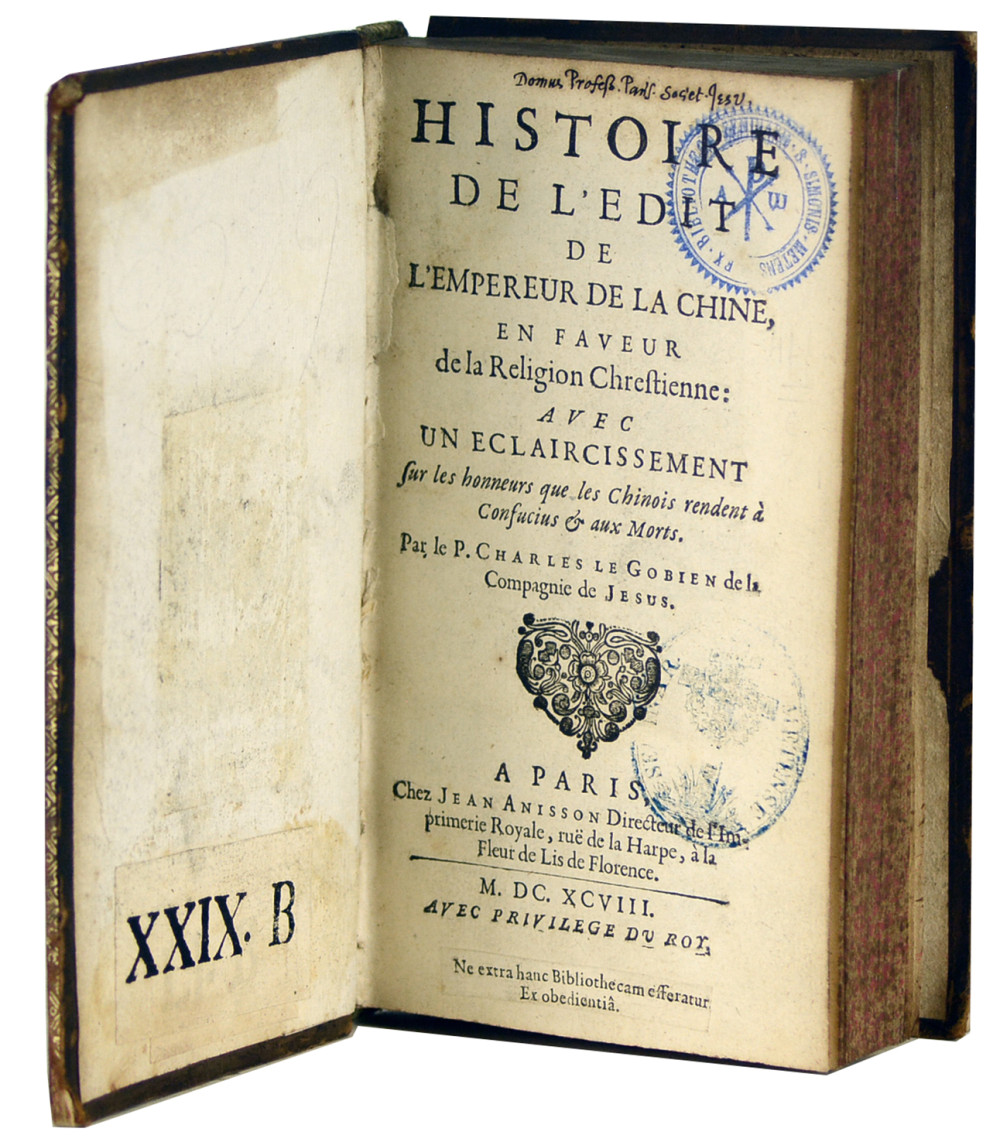 Cordier, Bibliotheca Sinica, 836. Carayon, Bibliographie historique de la Compagnie de Jésus, 1113. Édition originale rare. Né à Saint-Malo, le Père Charles de Gobien (1652-1708) fut, grâce à sa fonction de secrétaire des missions de la Chine, un des mieux informés sur les événements qui se déroulaient dans l'entourage de l'empereur Kang-hi. On lui doit les huit premiers recueils de Lettres édifiantes et curieuses. L'arrivée des Jésuites français en 1687 renforça leur rôle de conseillers scientifiques. Accueillis par l'empereur dans l'enceinte de sa Cité, il leur permit de construire une église qu'il honora d'une inscription et leur accorda l'édit de liberté (1692). Sachant concilier tradition chinoise et christianisme, les pères obtenaient des conversions appréciables : quelque 200 000 néophytes sont dénombrés à l'époque. Mais de graves dissensions internes entraînèrent la condamnation des « rites chinois », tels que les autorisaient bon nombre de Jésuites qui se refusaient d'interdire aux Chinois chrétiens le culte des ancêtres et de Confucius. Le Gobien mit le feu aux poudres en prenant parti contre Pascal et Bossuet, par exemple, qui les avaient condamnés comme déviation abusive de l'Evangile. En 1700, la Sorbonne renforcera cette censure, de même que Rome. La querelle amorça le déclin de l'influence des Jésuites, les mettant en porte-à-faux vis-à-vis de l'empereur qui ne pouvait tolérer que des étrangers puissent décider de ce qui était ou non acceptable en son empire. L'ouvrage du Père Le Gobien fait suite aux Nouveaux mémoires sur l'état présent de la Chine du Père Le Comte, publiés la même année ; ce dernier ne cessait de pourfendre les rites chinois. Cachets de bibliothèque sur la page de titre, le premier feuillet de garde est manquant. Exemplaire correct malgré les défauts signalés.