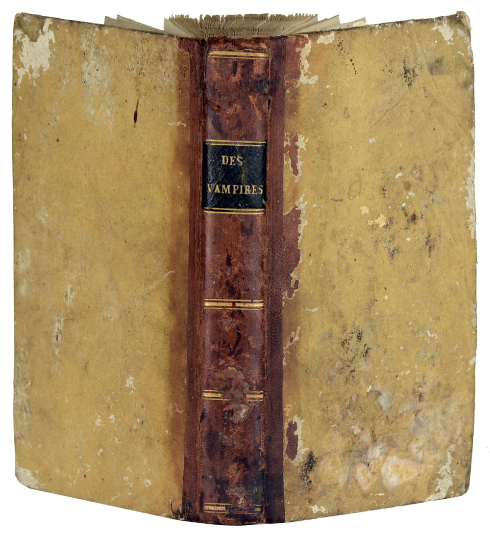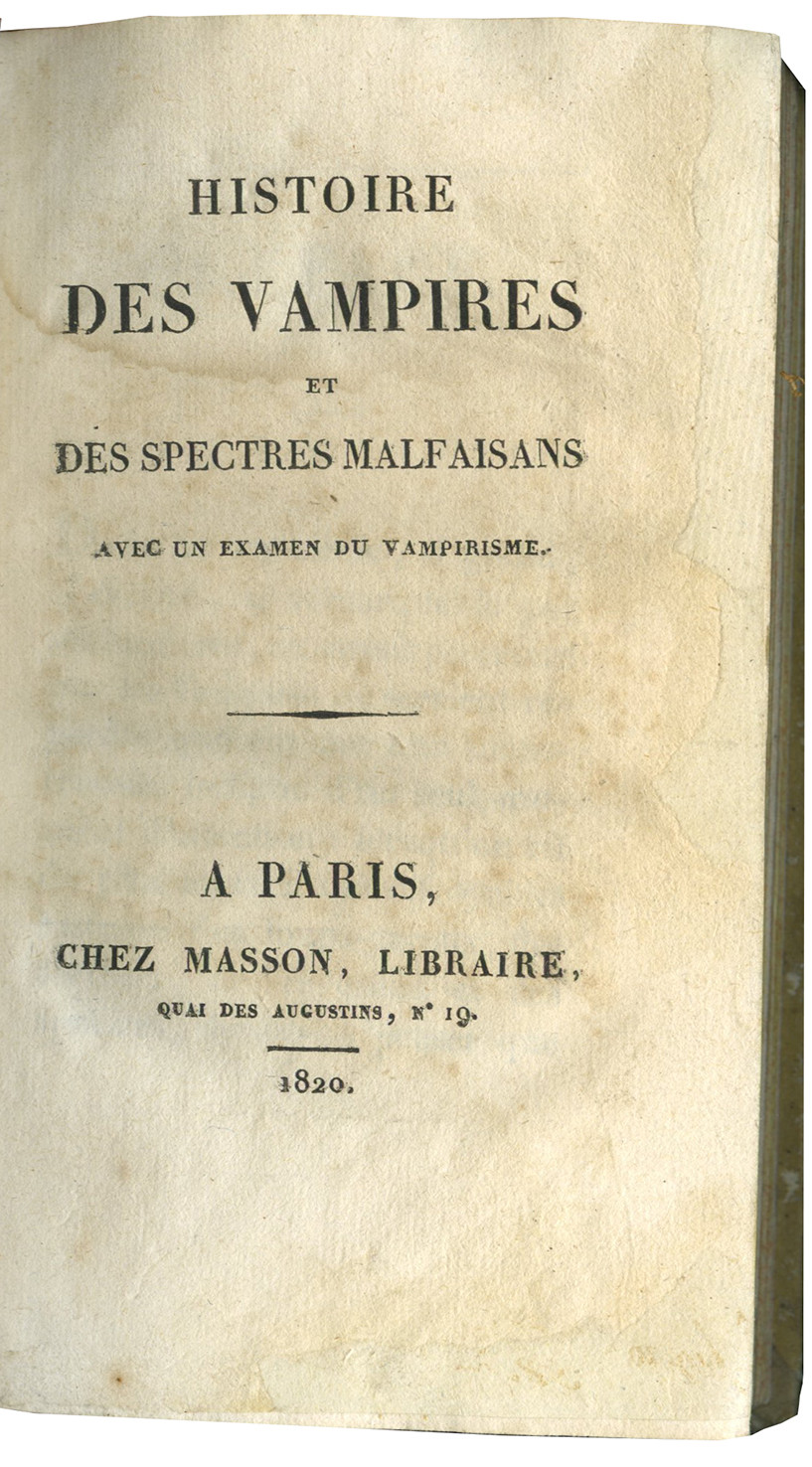 Guaïta, Catalogue de livres et manuscrits relatifs aux sciences occultes, 1250. Dorbon, Bibliotheca esoterica, 812. Caillet, Manuel bibliographique des sciences psychiques ou occultes, 2465. Édition originale attribuée à Jacques Collin de Plancy par les principales bibliographies même si, comme le souligne Dorbon, le doute est permis : "cet ouvrage anonyme a une grande analogie avec quelques écrits de Collin de Plancy et est certainement de lui, bien que, dans la bibliographie de 27 ouvrages sur les spectres, les vampires et les loups-garous, qu'il met à la fin de son Histoire, il critique, très légèrement d'ailleurs, son Dictionnaire infernal". Frontispice gravé en taille-douce par Berthe. On y voit une jeune femme éplorée, sur une tombe, surplombée par un vampire, et, en arrière-plan, un cadavre réanimé se dégageant de sa propre sépulture. Ex-libris manuscrit de L. Soehnée daté du 7 avril 1821 sur la page de garde. Traces de mouillures sur les 20 premiers et les 20 derniers feuillets, sans grande gravité, et page de titre restaurée. Exemplaire correct malgré les défauts signalés, sans mention d'édition. Rare et recherché.