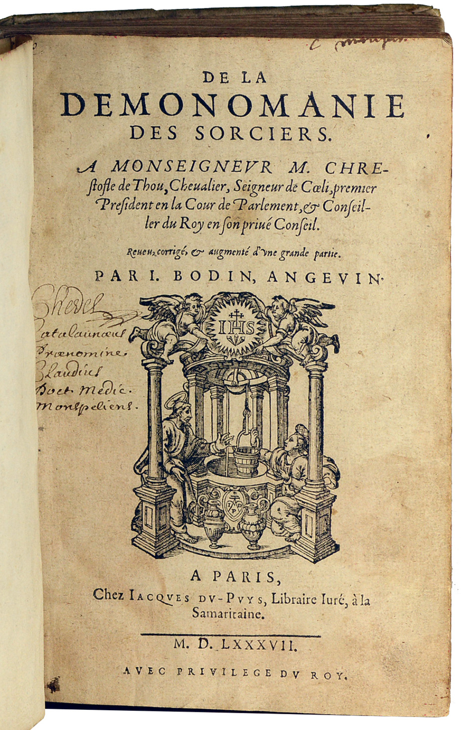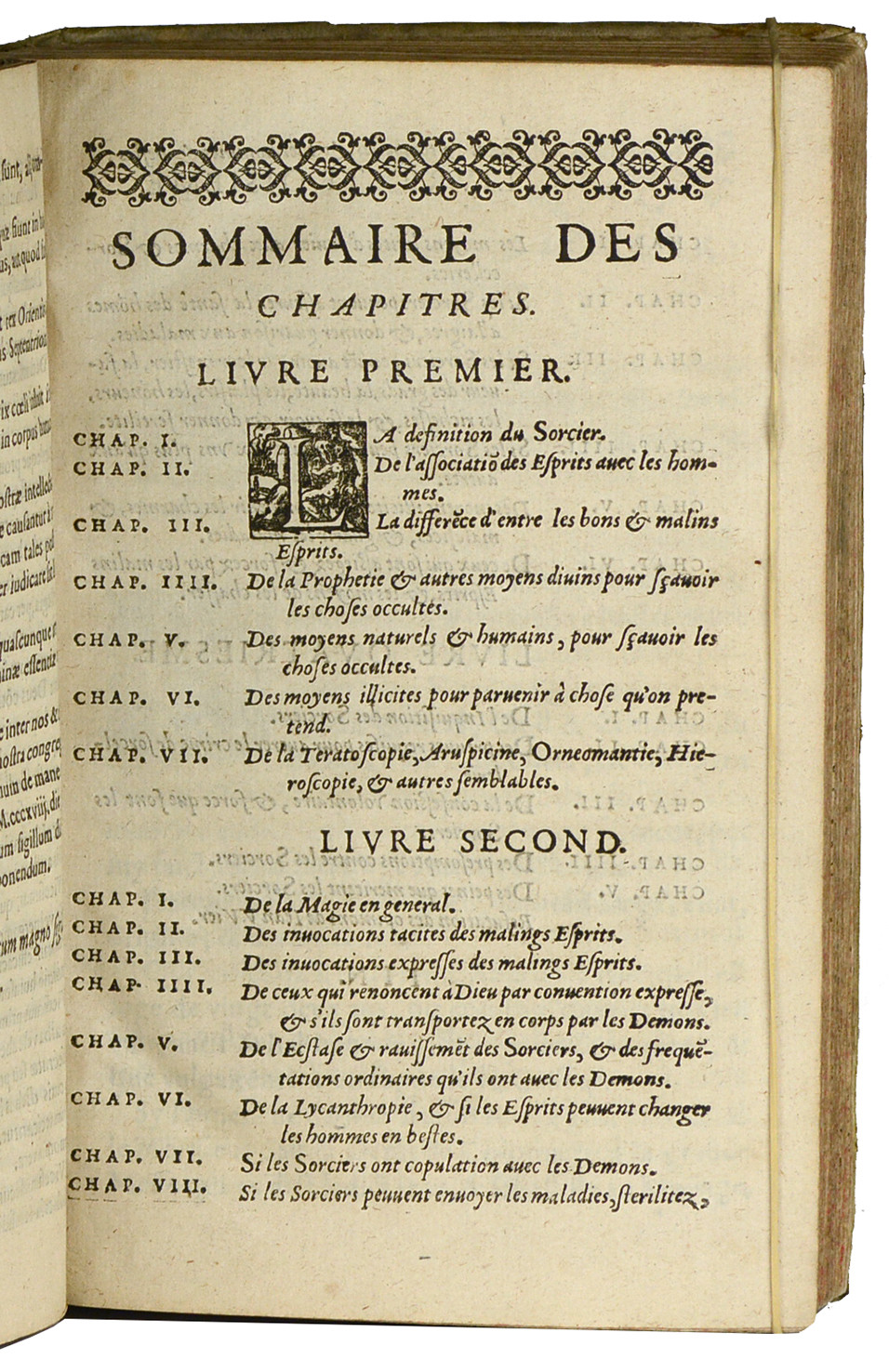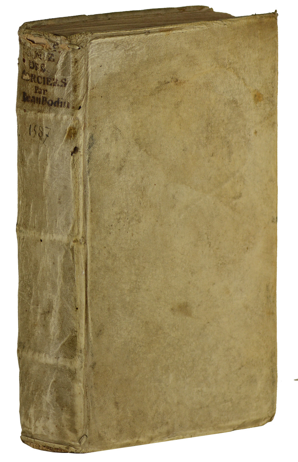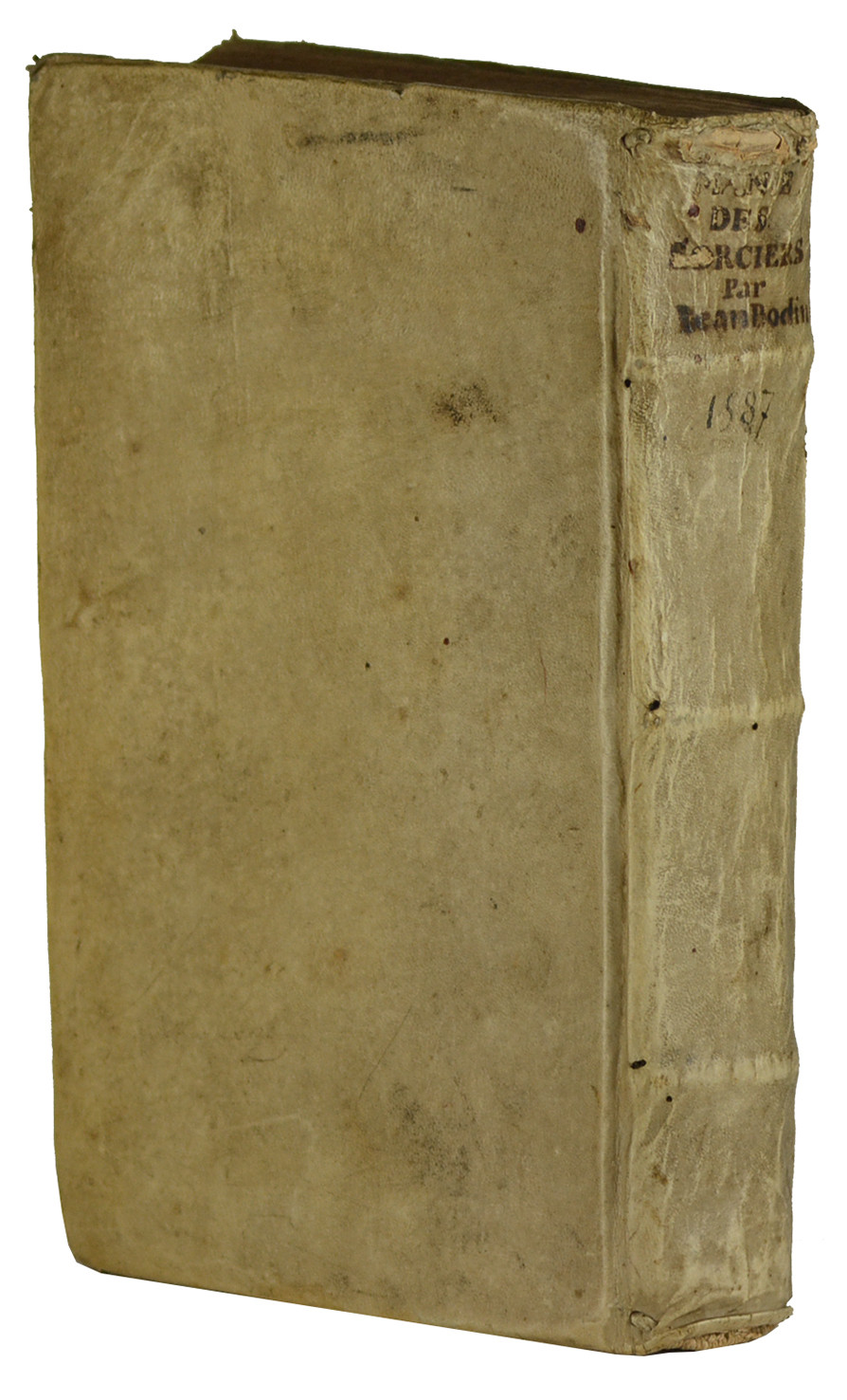 Caillet, Manuel bibliographique des sciences psychiques, 1269. Dorbon, Bibliotheca esoterica, p. 45. Nouvelle édition (la princeps date de 1580) de cet ouvrage "considéré comme le meilleur que l'on ait sur la sorcellerie" (Dorbon). "Seule complète, cette édition de 1587 comporte, à part le texte même entièrement remanié, 10 feuillets non paginés qui ne se trouvent dans aucune autre, sans excepter les éditions postérieures. Ces feuillets, qu'on peut lire immédiatement après la table des matières renferment la minute, in-extenso, du procès d'un sorcier du nom d'Abel de la Rue, ouvrier de vieil cuir condamné à mort par Nicolas Quatre Solz, lieutenant du Bailly de Colombier, homme de bien et studieux de la justice, 1582" (Caillet, qui ajoute ce commentaire trouvé chez Stanislas de Guaïta : "Cette pièce des plus curieuses ne se trouve nulle part ailleurs à ma connaissance". Exemplaire court de marges (l'édition est normalement au format in-4, mais le relieur a choisi ici un format plus "portatif"), présentant quelques traces de restauration ancienne : certains feuillets, dont les angles avaient été touchés par l'humidité, ont bénéficié d'un habile renforcement, ou d'une greffe de papier (sur les dix derniers feuillets) avec remplacement de quelques lettres imprimées perdues par des lettres manuscrites. Ex-libris manuscrit ancien d'un docteur diplômé de l’Université de Montpellier sur la page de titre, ex-libris manuscrit sur le premier contreplat. Bon exemplaire malgré les défauts signalés.