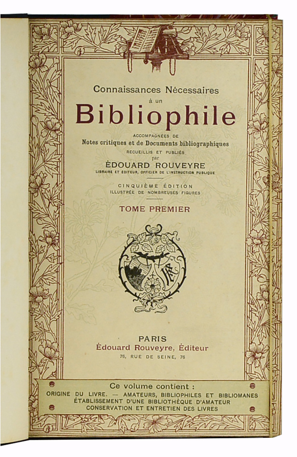 Cinquième et dernière édition, la plus complète et la plus recherchée, de cette somme dédiée aux amoureux du livre, où sont exposés l’univers matériel et culturel du livre ancien : reliure, papier, typographie, provenances, faux, curiosités bibliographiques, etc. La première édition parut de manière anonyme en 1877, et ne comportait que 80 pages. Édouard Rouveyre n'eut de cesse de l'améliorer et de l'augmenter, jusqu'à parvenir à la présente édition. Contient : Tome I — Origine du livre ; Du format des livres ; Du collationnement des livres ; Abréviations usitées en bibliographie ; Signes distinctifs des anciennes éditions ; Des souscriptions et de la date. Tome II — Du choix des livres. Tome III — De la gravure et de ses états. Tome IV — Les reliures aux chiffres ou à monogrammes ; Les reliures aux armes ; Les ex-libris ; Les livres avec dédicaces ou annotations manuscrites ; Les livres de provenance curieuse ou illustre. Tome V — Les manuscrits et la peinture des livres. Tome VI — Les ennemis du livre ; Altérations et fraudes. Tome VII — De la classification systématique des livres, des autographes et des gravures. Tome VIII — Outils du bibliophile et lexique bibliographique. Tome IX — Lexique et documents annexes. Tome X — Tables et index généraux. Très bel exemplaire, imprimé sur vélin teinté, présenté dans une reliure pastiche bien réalisée par Georges Gauché. Né en 1907, il fut d'abord apprenti chez Jean Duval puis ouvrier dans l’atelier Flammarion. Après divers ateliers, il s’installe en 1937 jusqu’en 1983 au 30 rue Jacob, dans l’ancien atelier de Pagnant ; il excellait dans la reliure classique et la demi-reliure.