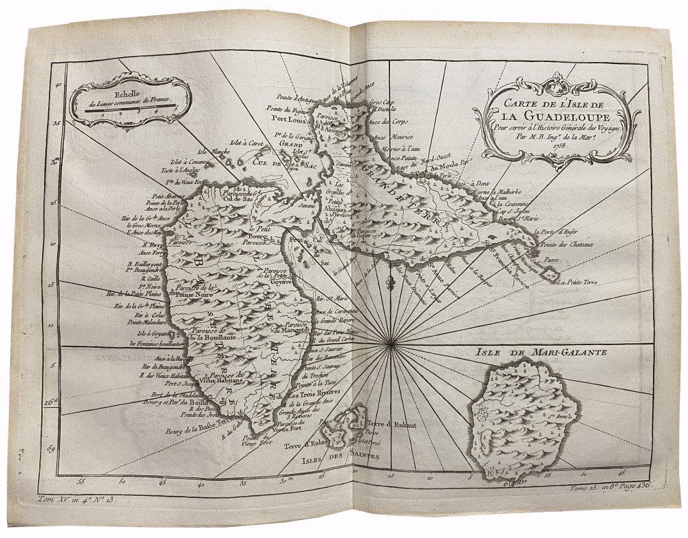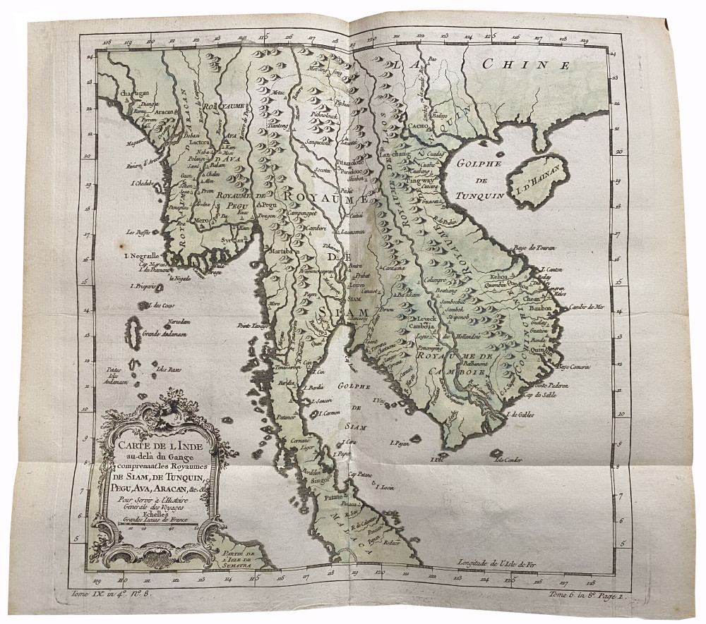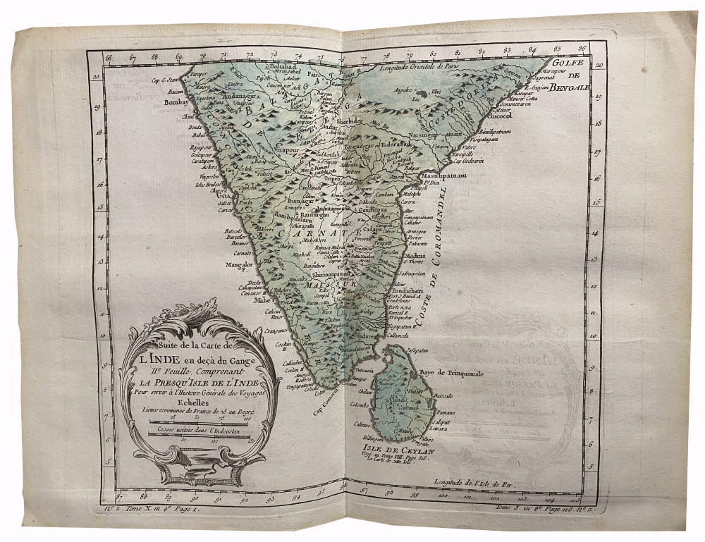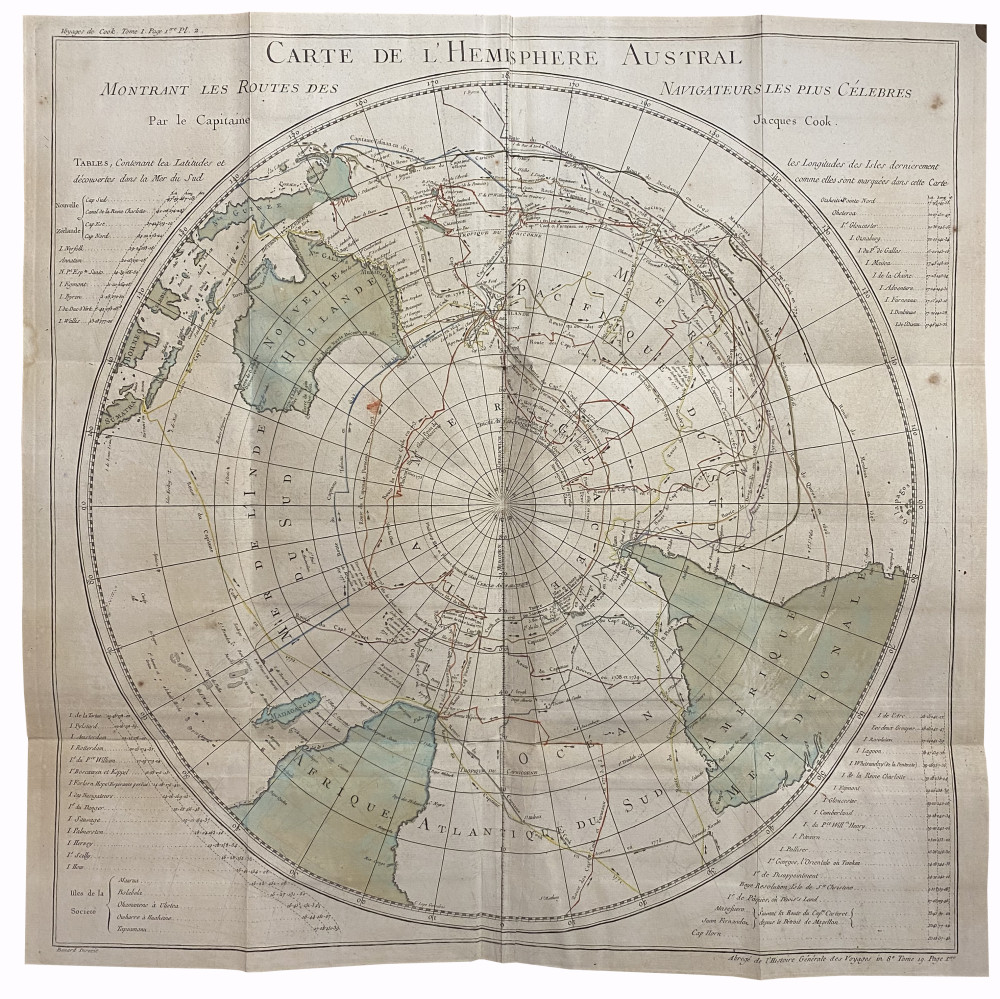 Brunet, II, 254-255. Les cartes sont celles des premières éditions françaises des voyages de Cook, parues en 1774-1785 au format in-4 puis in-8. Elles avaient été remises en vente séparément pour accompagner les deux éditions, et une partie d'entre-elles avaient été utilisées pour illustrer l'Histoire générale des voyages de l'abbé Prévost. Exemplaire complet des 75 cartes et du tableau dépliant. 65 d'entre-elles sont dépliantes, 29 sont agrémentées de coloris d’époque : 1. Planisphère (par N. Bellin, 53,5 x 74,5 cm). - 2. Côte orientale d'Afrique, depuis le Cap de Bonne Espérance, jusqu'au Cap del Gada (24,5 x 28 cm). - 3. Côte orientale d'Afrique, depuis le 13e degré de latitude méridional jusqu'au 16e degré de latitude septentrional (24,5 x 28 cm). - 4. Côtes de Perse, Gusarat et Malabar (24,5 x 28 cm). - 5. Côte d'Arabie, Mer Rouge et Golfe de Perse (24,5 x 28 cm). - 6. Îles Canari (par N. Bellin, 32,5 x 24,5 cm). - 7. Cap Vert (par N. Bellin, 32,5 x 24,5 cm). - 8. Côte occidentale d'Afrique, depuis le Détroit de Gibraltar jusqu'au 11e degré de latitude septentrional (24,5 x 28 cm). - 9. Côte occidentale d'Afrique, depuis le 12e degré de latitude septentrional jusqu'au 11e degré de latitude méridional (9,5 x 24,5 cm). - 10. Côte occidental d'Afrique, depuis le 11e degré de latitude méridional jusqu'au Cap de Bonne Espérance (32,5 x 27,5 cm). - 11. Royaumes de Congo, Angola, et Benguela. Avec les pays voisins (29 x 33 cm). - 12. Le Pays des Hottentots aux environs du Cap de Bonne Espérance (28,2 x 37 cm). - 13. Empire du Monomotapa et États voisins (24,5 x 33 cm). - 14. Îles Maldives (24,5 x 18 cm). - 15. Île de Ceylan (28,5 x 28 cm). - 16. Îles de Java, Sumatra, Bornéo & les Détroits de la Sonde, Malaca et Banca, Golfe de Siam (28 x 33 cm). - 17. Île Moluques (24,5 x 17 cm). - 18. Île Célèbes ou Macassar (24,5 x 17 cm). - 19. Carte des Îles Philippines, dressée sur la carte espagnole du R. P. Murillo de Velarde, 1ere feuille (24,5 x 17 cm). - 20. Carte des Îles Philippines, dressée sur la carte espagnole du R. P. Murillo de Velarde, 2e feuille (24,5 x 33 cm). - 21. Archipel de Saint-Lazare ou les Îles Mariannes (24,5 x 17,5 cm). - 22. Inde en-deçà du Gange comprenant l'Indoustan &c. (24,5 x 37,5 cm). - 23. Suite de la carte de l'Inde en-deçà du Gange, 2e feuille comprenant la Presqu'île de l'Inde (24,5 x 32,5 cm). - 24. Carte de l'Inde au-delà du Gange comprenant les Royaumes de Siam, de Tunquin, Pugu, Ava, Aracan, &c (30 x 33 cm). - 25. L'Empire de la Chine (32 x 43 cm). - 26. Tartarie orientale (24,5 x 33 cm). - 27. Tartarie Occidentale (24,5 x 33 cm). - 28. Sibérie et Pays voisins (32 x 49 cm). - 29. Suite de la carte de la Sibérie et le Pays de Kamtschatka (28 x 33 cm). - 30. Pays habités par les Samojedes et Ostiacs (24,5 x 33 cm). - 31. Empire du Japon (24,5 x 33 cm). - 32. Golfe du Mexique et Îles de l'Amérique (30,5 x 41,5 cm). - 33. Empire du Mexique (24,5 x 33 cm). - 34. Lac de Mexico et ses environs (24,5 x 17 cm). - 35. Pérou (39 x 24,5 cm). - 36. Cours du Maragnon ou de la Grande Rivière des Amazones (24,5 x 41,5 cm). - 37. Amérique Méridionale (47 x 33 cm). - 38. Rivière de la Plata (24,5 x 33 cm). - 39. Paraguay et Pays voisins (24,5 x 33 cm). - 40. Guyane (37 x 33 cm). - 41. Brésil, 1ère partie : depuis la Rivière des Amazones jusqu'à la Baie de tous les Saints (27,5 x 33 cm). - 42. Suite du Brésil depuis la Baie de tous les Saints jusqu'à Saint-Paul (34,5 x 17 cm). - 43. Suite du Brésil (34,5 x 17 cm). - 44. Floride, Louisiane et Pays voisins (24,5 x 33 cm). - 45. Virginie, Baie Chesapeack et Pays voisins (24,5 x 33 cm). - 46. Nouvelle Angleterre, Nouvelle York et Pensilvanie (24,5 x 33 cm). - 47. Caroline et Géorgie (24,5 x 33 cm). - 48. Baie de Hudson (24,5 x 33 cm). - 49. Acadie, Île Royale et Pays voisins (24,5 x 36 cm). - 50. Cours du Fleuve Saint-Laurent depuis son embouchure jusqu'au-dessus de Québec (24,5 x 33 cm). - 51. Suite du cours du Fleuve de Saint-Laurent, depuis Québec jusqu'au Lac Ontario (24,5 x 33 cm). - 52. Golfe de Saint-Laurent et Pays voisins (24,5 x 38,5 cm). - 53. Île de Saint-Domingue (24,5 x 33 cm). - 54. Île de la Martinique (24,5 x 33 cm). - 55. Île de la Guadeloupe (24,5 x 33 cm). - 56. Île de la Grenade (24,5 x 17 cm). - 57. Île de Sainte-Lucie (24,5 x 33 cm). - 58. Île Saint-Christophe (24,5 x 33 cm). - 59. Île de la Jamaïque (24,5 x 33 cm). - 60. Île de la Barbade (24,5 x 17 cm). - 61. Carte réduite du Détroit de Magellan (24,5 x 37 cm). - 62. Détroit de Le Maire (24,5 x 33 cm). - 63. Carte particulière de l'Île de Juan Fernandes (24,5 x 33 cm). - 64. Carte réduite des Mers du Nord (36 x 49 cm). - 65. Détroit de Waeigats ou de Nassau (24,5 x 33 cm). - 66. Spitzberg (24,5 x 33 cm). - 67. Islande (33 x 41 cm). - 68. Partie de la Mer Glaciale, contenant la Nouvelle Zemble et le Pays des Samoiedes (24,5 x 39 cm). - 69. Kamtchatka (53,5 x 31,5 cm). - 70. Îles Kouriles (28 x 33 cm). - 71. Groenland (24,5 x 33 cm). - 72. Carte de l'hémisphère austral montrant les routes des navigateurs les plus célèbres, par le Capitaine "Jacques" Cook (55,5 x 57 cm). - 73. Tahiti (27 x 43 cm). - 74. Carte des découvertes faites dans la Mer Pacifique sur le Vaisseau de Roi La Résolution, commandé par le Capitaine Cook en 1774 (Nouvelle Calédonie, Nouvelles Zébrides) (39,5 x 51 cm). - 75. Partie septentrionale de la Mer du Sud, comprise entre la Californie, les Iles Sandwich, le Japon et le Détroit de Béring (29 x 40 cm). - Le tableau dépliant est intitulé : Table des différentes langues de la Mer du Sud, comparées avec celles des différentes Nations situées à l'Est & à l'Ouest de ces îles (37,5 x 51 cm). Reliure solide malgré les défauts d'usage signalés ; les cartes sont bien conservées.