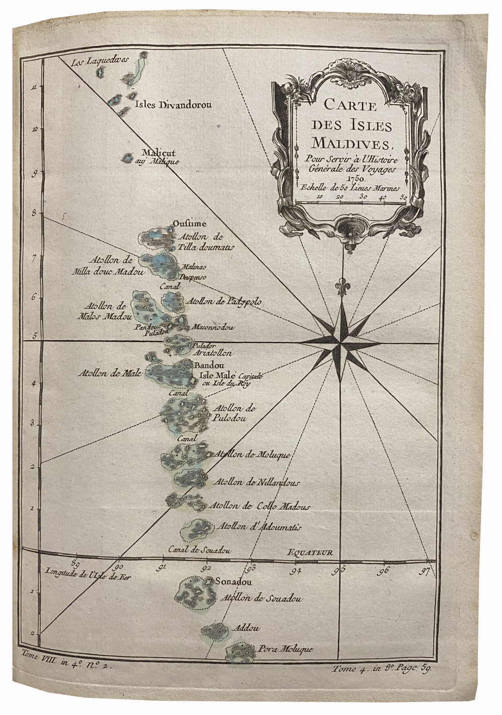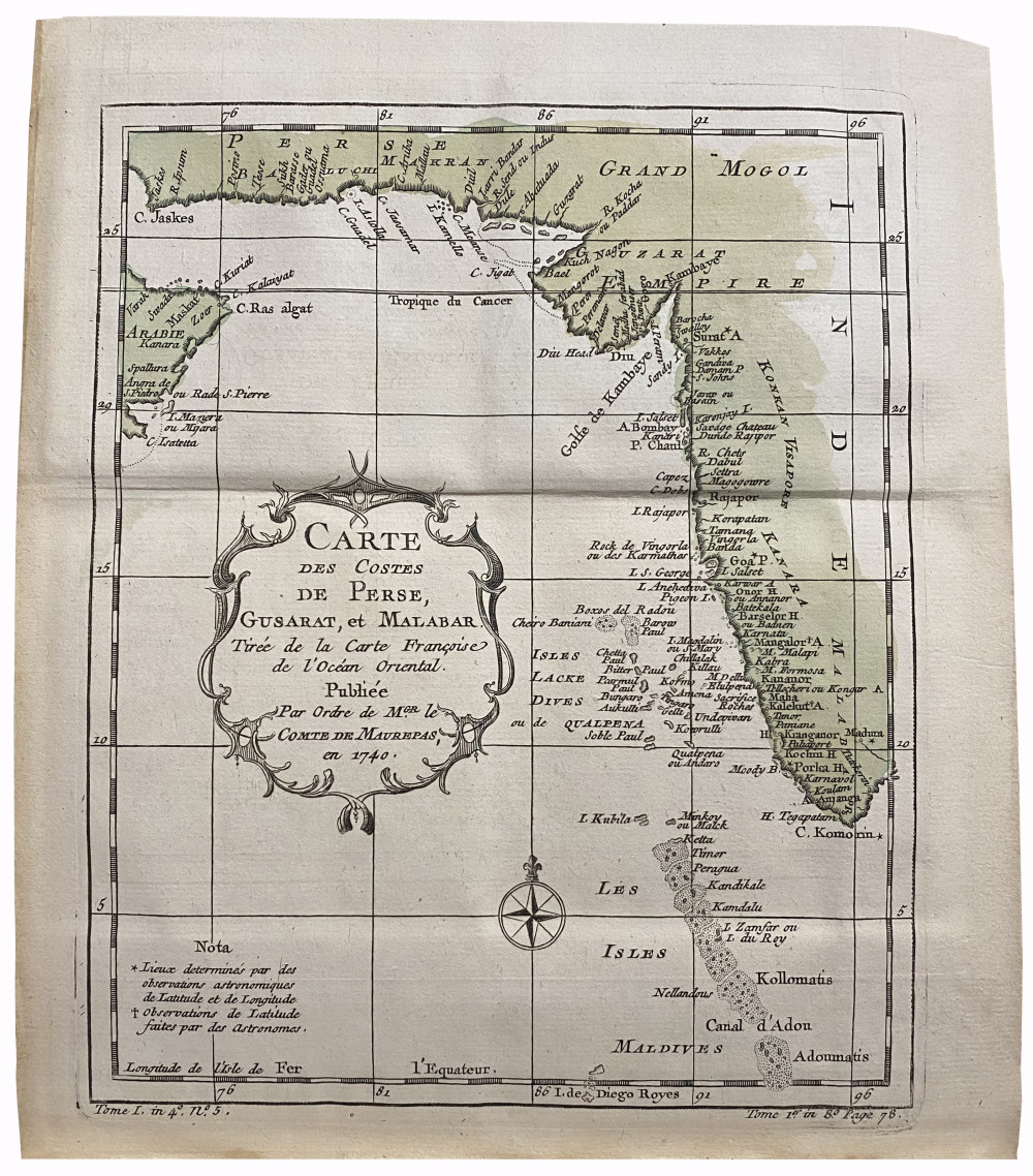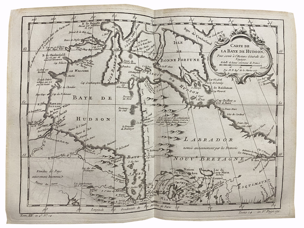 Brunet, II, 254-255. Les cartes sont celles des premières éditions françaises des voyages de Cook, parues en 1774-1785 au format in-4 puis in-8. Elles avaient été remises en vente séparément pour accompagner les deux éditions, et une partie d'entre-elles avaient été utilisées pour illustrer l'Histoire générale des voyages de l'abbé Prévost. Exemplaire complet des 75 cartes et du tableau dépliant. 65 d'entre-elles sont dépliantes, 29 sont agrémentées de coloris d’époque : 1. Planisphère (par N. Bellin, 53,5 x 74,5 cm). - 2. Côte orientale d'Afrique, depuis le Cap de Bonne Espérance, jusqu'au Cap del Gada (24,5 x 28 cm). - 3. Côte orientale d'Afrique, depuis le 13e degré de latitude méridional jusqu'au 16e degré de latitude septentrional (24,5 x 28 cm). - 4. Côtes de Perse, Gusarat et Malabar (24,5 x 28 cm). - 5. Côte d'Arabie, Mer Rouge et Golfe de Perse (24,5 x 28 cm). - 6. Îles Canari (par N. Bellin, 32,5 x 24,5 cm). - 7. Cap Vert (par N. Bellin, 32,5 x 24,5 cm). - 8. Côte occidentale d'Afrique, depuis le Détroit de Gibraltar jusqu'au 11e degré de latitude septentrional (24,5 x 28 cm). - 9. Côte occidentale d'Afrique, depuis le 12e degré de latitude septentrional jusqu'au 11e degré de latitude méridional (9,5 x 24,5 cm). - 10. Côte occidental d'Afrique, depuis le 11e degré de latitude méridional jusqu'au Cap de Bonne Espérance (32,5 x 27,5 cm). - 11. Royaumes de Congo, Angola, et Benguela. Avec les pays voisins (29 x 33 cm). - 12. Le Pays des Hottentots aux environs du Cap de Bonne Espérance (28,2 x 37 cm). - 13. Empire du Monomotapa et États voisins (24,5 x 33 cm). - 14. Îles Maldives (24,5 x 18 cm). - 15. Île de Ceylan (28,5 x 28 cm). - 16. Îles de Java, Sumatra, Bornéo & les Détroits de la Sonde, Malaca et Banca, Golfe de Siam (28 x 33 cm). - 17. Île Moluques (24,5 x 17 cm). - 18. Île Célèbes ou Macassar (24,5 x 17 cm). - 19. Carte des Îles Philippines, dressée sur la carte espagnole du R. P. Murillo de Velarde, 1ere feuille (24,5 x 17 cm). - 20. Carte des Îles Philippines, dressée sur la carte espagnole du R. P. Murillo de Velarde, 2e feuille (24,5 x 33 cm). - 21. Archipel de Saint-Lazare ou les Îles Mariannes (24,5 x 17,5 cm). - 22. Inde en-deçà du Gange comprenant l'Indoustan &c. (24,5 x 37,5 cm). - 23. Suite de la carte de l'Inde en-deçà du Gange, 2e feuille comprenant la Presqu'île de l'Inde (24,5 x 32,5 cm). - 24. Carte de l'Inde au-delà du Gange comprenant les Royaumes de Siam, de Tunquin, Pugu, Ava, Aracan, &c (30 x 33 cm). - 25. L'Empire de la Chine (32 x 43 cm). - 26. Tartarie orientale (24,5 x 33 cm). - 27. Tartarie Occidentale (24,5 x 33 cm). - 28. Sibérie et Pays voisins (32 x 49 cm). - 29. Suite de la carte de la Sibérie et le Pays de Kamtschatka (28 x 33 cm). - 30. Pays habités par les Samojedes et Ostiacs (24,5 x 33 cm). - 31. Empire du Japon (24,5 x 33 cm). - 32. Golfe du Mexique et Îles de l'Amérique (30,5 x 41,5 cm). - 33. Empire du Mexique (24,5 x 33 cm). - 34. Lac de Mexico et ses environs (24,5 x 17 cm). - 35. Pérou (39 x 24,5 cm). - 36. Cours du Maragnon ou de la Grande Rivière des Amazones (24,5 x 41,5 cm). - 37. Amérique Méridionale (47 x 33 cm). - 38. Rivière de la Plata (24,5 x 33 cm). - 39. Paraguay et Pays voisins (24,5 x 33 cm). - 40. Guyane (37 x 33 cm). - 41. Brésil, 1ère partie : depuis la Rivière des Amazones jusqu'à la Baie de tous les Saints (27,5 x 33 cm). - 42. Suite du Brésil depuis la Baie de tous les Saints jusqu'à Saint-Paul (34,5 x 17 cm). - 43. Suite du Brésil (34,5 x 17 cm). - 44. Floride, Louisiane et Pays voisins (24,5 x 33 cm). - 45. Virginie, Baie Chesapeack et Pays voisins (24,5 x 33 cm). - 46. Nouvelle Angleterre, Nouvelle York et Pensilvanie (24,5 x 33 cm). - 47. Caroline et Géorgie (24,5 x 33 cm). - 48. Baie de Hudson (24,5 x 33 cm). - 49. Acadie, Île Royale et Pays voisins (24,5 x 36 cm). - 50. Cours du Fleuve Saint-Laurent depuis son embouchure jusqu'au-dessus de Québec (24,5 x 33 cm). - 51. Suite du cours du Fleuve de Saint-Laurent, depuis Québec jusqu'au Lac Ontario (24,5 x 33 cm). - 52. Golfe de Saint-Laurent et Pays voisins (24,5 x 38,5 cm). - 53. Île de Saint-Domingue (24,5 x 33 cm). - 54. Île de la Martinique (24,5 x 33 cm). - 55. Île de la Guadeloupe (24,5 x 33 cm). - 56. Île de la Grenade (24,5 x 17 cm). - 57. Île de Sainte-Lucie (24,5 x 33 cm). - 58. Île Saint-Christophe (24,5 x 33 cm). - 59. Île de la Jamaïque (24,5 x 33 cm). - 60. Île de la Barbade (24,5 x 17 cm). - 61. Carte réduite du Détroit de Magellan (24,5 x 37 cm). - 62. Détroit de Le Maire (24,5 x 33 cm). - 63. Carte particulière de l'Île de Juan Fernandes (24,5 x 33 cm). - 64. Carte réduite des Mers du Nord (36 x 49 cm). - 65. Détroit de Waeigats ou de Nassau (24,5 x 33 cm). - 66. Spitzberg (24,5 x 33 cm). - 67. Islande (33 x 41 cm). - 68. Partie de la Mer Glaciale, contenant la Nouvelle Zemble et le Pays des Samoiedes (24,5 x 39 cm). - 69. Kamtchatka (53,5 x 31,5 cm). - 70. Îles Kouriles (28 x 33 cm). - 71. Groenland (24,5 x 33 cm). - 72. Carte de l'hémisphère austral montrant les routes des navigateurs les plus célèbres, par le Capitaine "Jacques" Cook (55,5 x 57 cm). - 73. Tahiti (27 x 43 cm). - 74. Carte des découvertes faites dans la Mer Pacifique sur le Vaisseau de Roi La Résolution, commandé par le Capitaine Cook en 1774 (Nouvelle Calédonie, Nouvelles Zébrides) (39,5 x 51 cm). - 75. Partie septentrionale de la Mer du Sud, comprise entre la Californie, les Iles Sandwich, le Japon et le Détroit de Béring (29 x 40 cm). - Le tableau dépliant est intitulé : Table des différentes langues de la Mer du Sud, comparées avec celles des différentes Nations situées à l'Est & à l'Ouest de ces îles (37,5 x 51 cm). Reliure solide malgré les défauts d'usage signalés ; les cartes sont bien conservées.