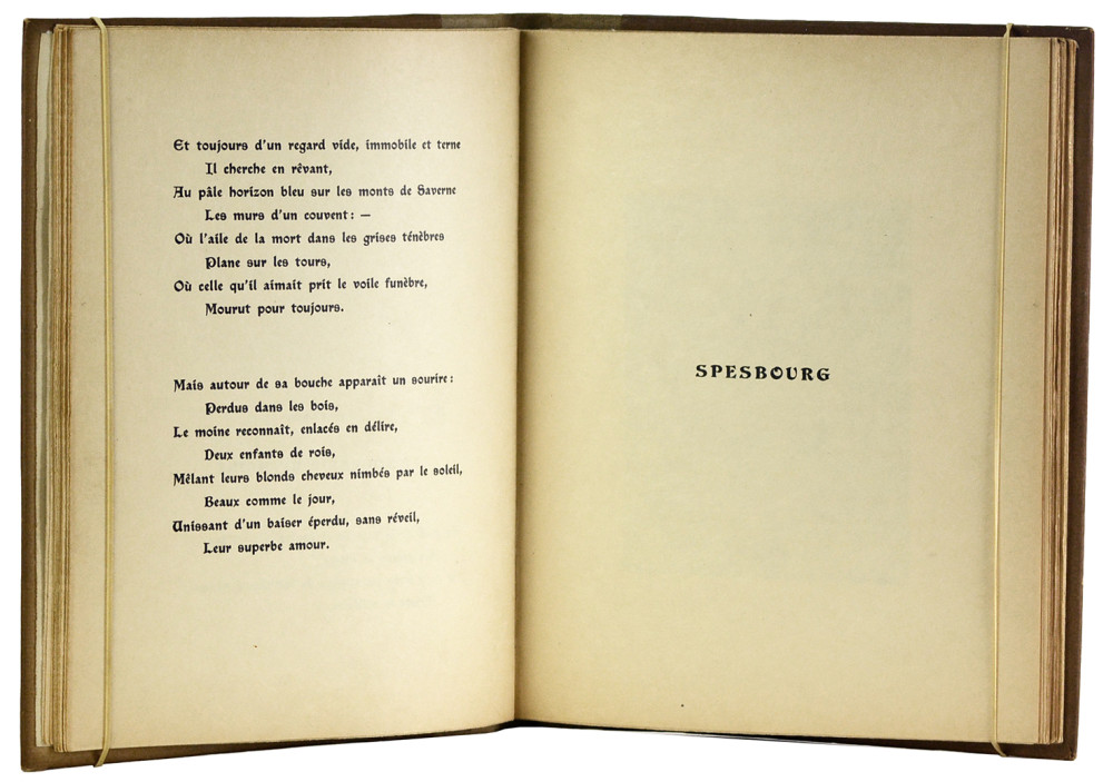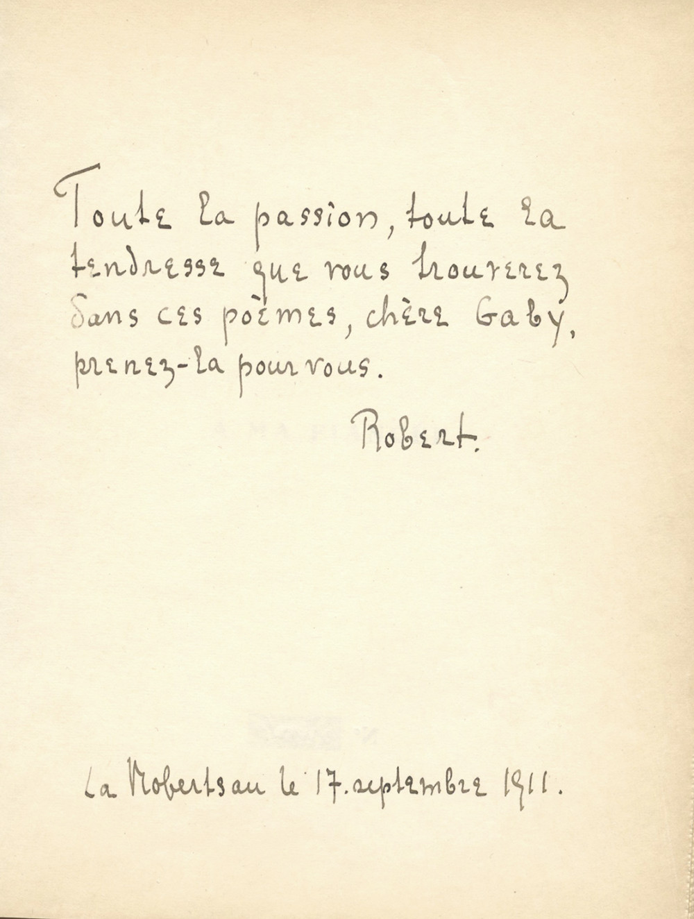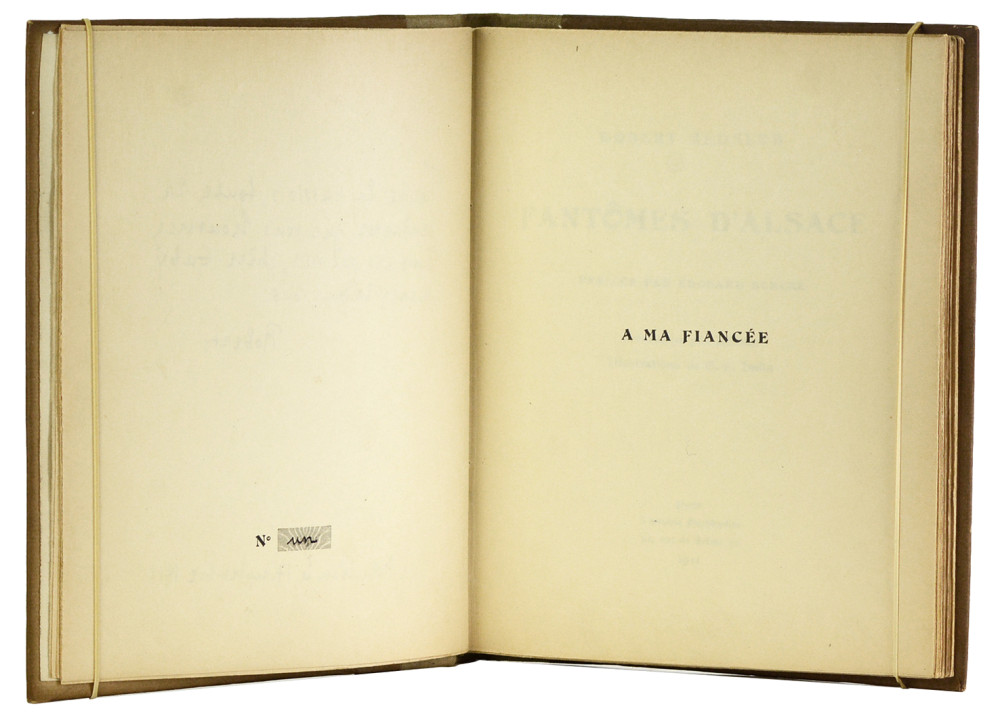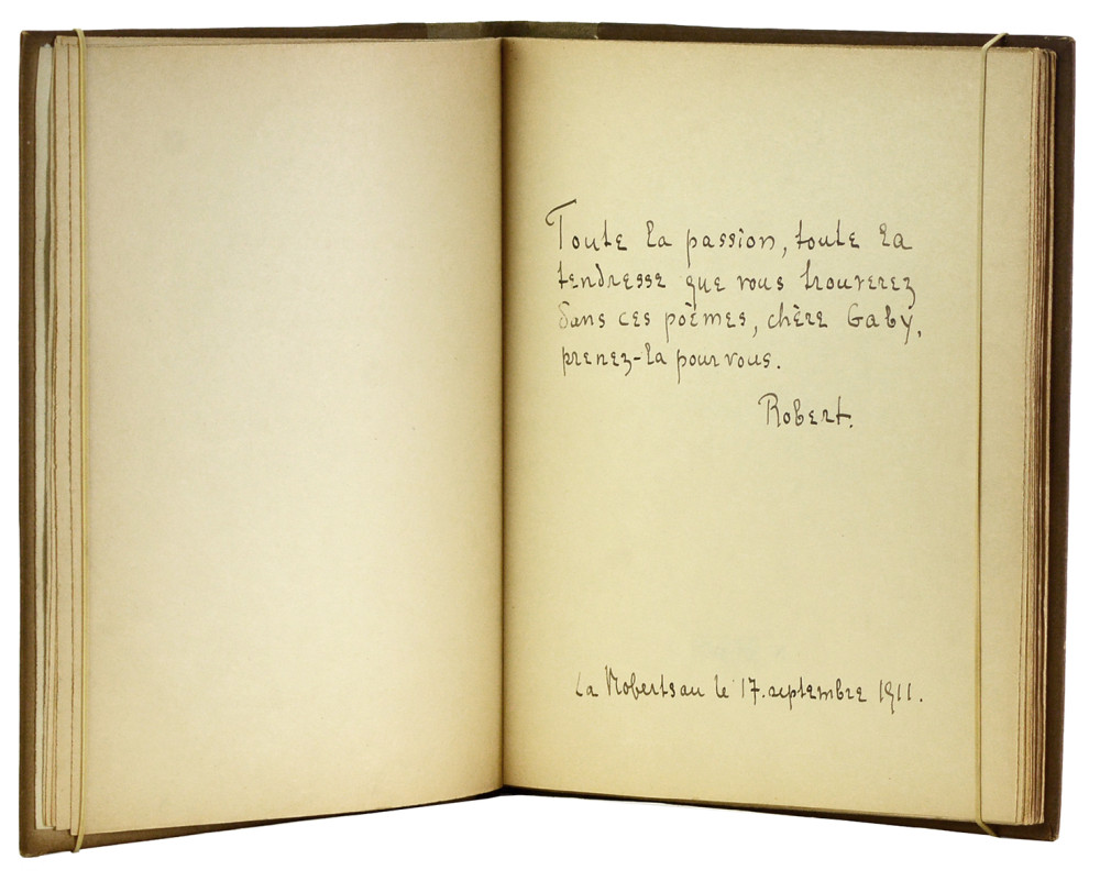 Édition originale de ce recueil de poèmes de Robert Redslob, qui n'avait publié jusque-là que trois pièces de théâtre en langue allemande. Exemplaire exceptionnel, tiré sur papier japon, numéroté "un" à la main, avec la dédicace imprimée "à ma fiancée" et cette très belle dédicace autographe : "Toute la passion, toute la tendresse que vous trouverez dans ces poèmes, chère Gaby, prenez-la pour vous. Robert. La Robertsau le 17 septembre 1911". Robert Redslob épousa la fiancée en question, Gabrielle Blanche Kiener, le 30 septembre 1911, soit quelques jours après qu'il ait dédicacé ce livre, dont on ne pourrait trouver plus intime et plus émouvante provenance. Le frontispice annoncé au titre est l'illustration contrecollée sur la couverture ; les 5 illustrations de Emmanuel-Frédéric Imlin (1782-1831) ont été très soigneusement reproduites à l'héliogravure. Il n'y a pas de justification de tirage, et nous ne connaissons pas d'autre exemplaire imprimé sur japon. Bel exemplaire.