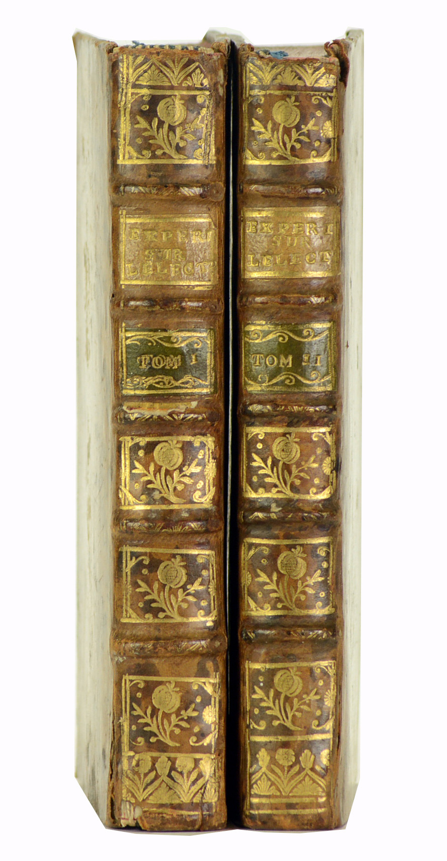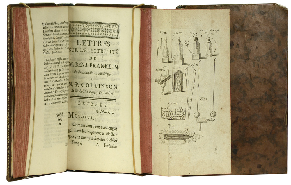 Seconde édition, en partie originale, car augmentée de la troisième partie des Nouvelles expériences, publiée en 1754. La première édition française (1752) avait été commandée par Buffon à François d'Alibard. Ouvrage capital de l’histoire des sciences, ces Expériences et observations sur l’électricité réunissent les célèbres lettres par lesquelles le savant américain fit connaître à l’Europe le résultat de ses recherches menées à Philadelphie. Publiées initialement sous forme de correspondance scientifique, ces observations contribuèrent de manière décisive à la compréhension moderne des phénomènes électriques. Bel exemplaire hormis les défauts signalés à la reliure. En l'état.