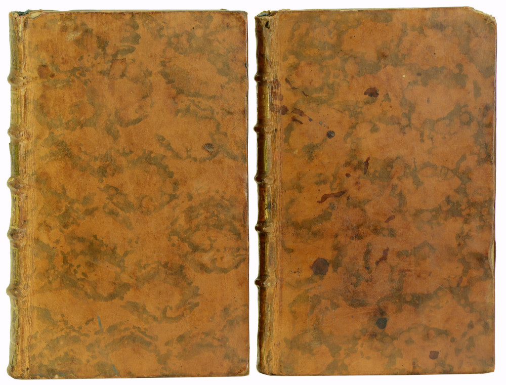 Paris, Durand, 1756 ; 2 volumes in-8, 3 ff.n.ch. + 28 pp. + XC pp. + 6 ff.n.ch. + 245 pp. + 1 f. de planche dépliant + 349 pp. + 1 f. de planche dépliant (placé après la page 128) pp., plein veau glacé marbré de l'époque, dos ornés à nerfs, pièces de titre beiges, pièces de tomaisons vertes, roulette sur les coupes, tranches rouges (les 2 coiffes supérieures sont arasées, manques de cuir à une encoche de coiffe inférieure du tome Ier, 3 coins abîmés avec manques). Les 2 volumes.