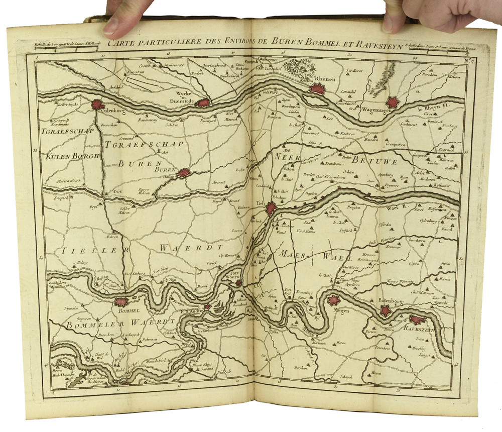 Atlas militaire peu commun, bien complet de ses 25 cartes (une générale, non chiffrée ; 24 particulières, chiffrées 1 à 24), dressé pour les officiers participant aux opérations de la Guerre de Succession d’Autriche qui venait de commencer (les Pays-Bas appartenaient aux Habsbourg, et les Provinces-Unies soutenaient l’Autriche, comme l’Angleterre). Il pouvait être assemblé en divers formats, comme indiqué dans le cartouche de légende qui ornait parfois la première feuille mais qui est ici absent. I. Carte générale du Duché de Brabant et partie de la Hollande. - II. Carte particulière des environs de La Haye, Leyden [Leyde] et Delft. - III. Carte particulière des environs d’Utrecht, Goude [Gouda] et Woerden. - IV. Carte particulière des environs d'Amersfoort. - V. Carte particulière des environs de Zutphen et Doesburg [Duisburg]. - VI. Carte particulière des environs de Rotterdam et Schiedam. - VII. Carte particulière des environs de Dordrecht, Gorcum et Heusden. - VIII. Carte particulière des environs de Buren, Bommel et Raveysten. - IX. Carte des environs de Nimmegen ou Nieumègue [Nimwegen], de Grave et Emmerick. - X. Carte particulière des environs de Willemstad, Steenbergen, et Berg-op-Zoom. - XI. Carte particulière des environs de Breda et Geertruydenberg. - XII. Carte particulière des environs de Bosleduc [Bois- le-Duc] et Helmont. - XIII. Carte particulière des environs de Gennep, Goch et Straelen. - XIV. Carte particulière des environs d’Anvers. - XV. Carte particulière d’une partie du comté de Hoogstraten. - XVI. Carte particulière des environs de Weert, Hamont et Eindhoven. - XVII. Carte particulière des environs de Venlo et Roermonde. - XVIII. Carte particulière des environs de Lier et de Malines. - XIX. Carte particulière des environs d’Herentals, Aerschot et Diest. - XX. Carte particulière des environs de Peer et de Brey. - XXI. Carte particulière des environs de Maeseyck, Stochem et Hinsberg. - XXII. Carte particulière des environs de Bruxelles et Vilvorden. - XXIII. Carte particulière des environs de Louvain, Tirlemont et Leeuwe. - XXIV. Carte particulière des environs de Hasselt, Maestricht et Tongres. - XXV. Carte particulière des environs de Fauquemont et Aix-la-Chapelle. Le relieur, qui ne manquait pas d'humour, a relié la carte particulière des environs d'Anvers… à l'envers. Toutes les places fortes indiquées sur les cartes ont été coloriées en rouge. Les feuillets sont montés sur onglets ; plis parfois brunis mais bon exemplaire.