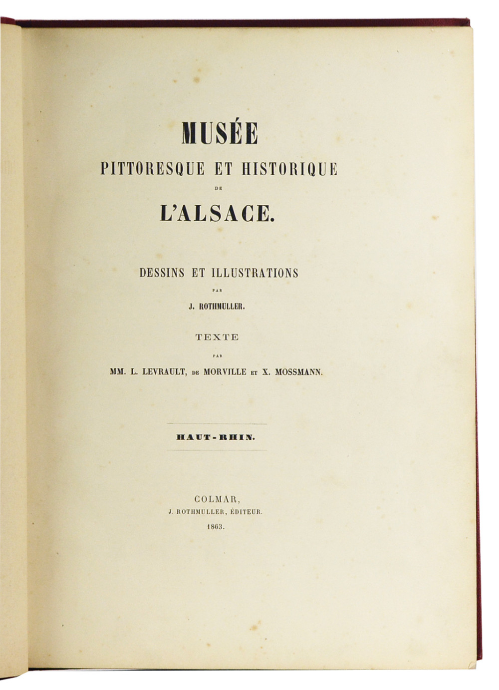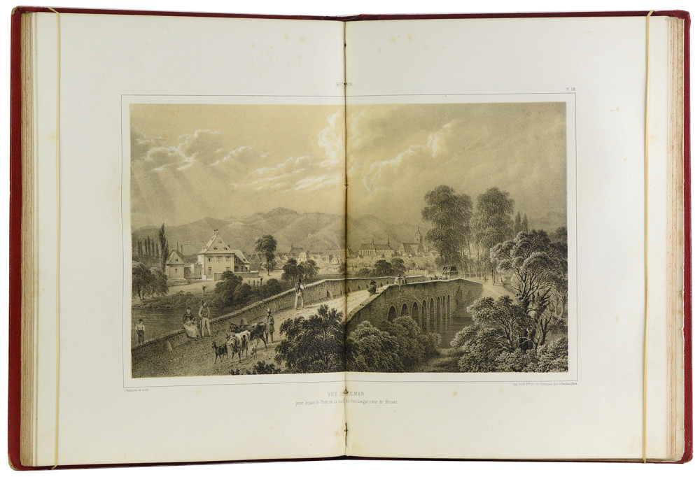 Édition originale et premier tirage des 104 lithographies tirées en bistre, réparties sur 73 feuillets (avec de nombreuses erreurs de numérotation). Rothmuller s'attaqua à cette œuvre majeure dès 1852. Ce travail de longue haleine fut interrompu par la mort de l'artiste, et seul le premier volume, avec ses 104 lithographies sur fond teinté consacrées au Haut-Rhin, put paraître en 1863. "Il s'agit d'un ouvrage assurément plus élaboré que le précédent (Vues pittoresques des châteaux etc.) auquel il est techniquement supérieur, d'une belle typographie, et, en général d'une présentation beaucoup plus soignée … (Dans les lithographies, on sent) une plus grande maîtrise peut-être, une habileté plus consommée dans la représentation des détails, des personnages, des cavaliers, dans la façon de caractériser les arbres d'essences différentes. La maturité du talent est ici évidente." (Paul Ahnne). Rousseurs éparses assez habituelles sur certaines lithographies, plus ou moins prononcées ; les quatre derniers feuillets de planches sont détachés et comportent des petites déchirures dans les marges. Bon exemplaire hormis ce défaut, agréablement relié. En l'état.