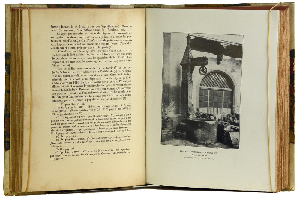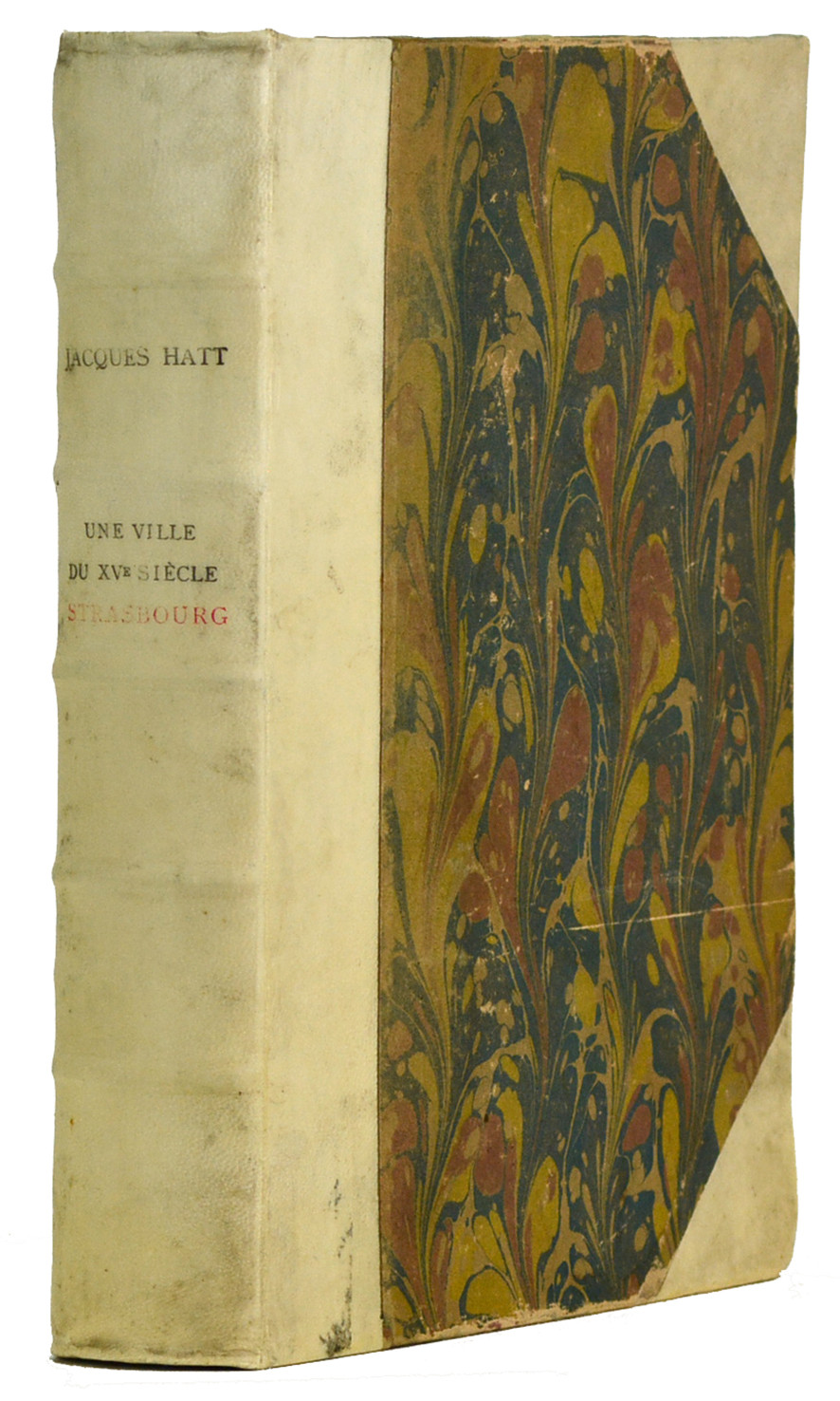 Édition originale, un des 525 exemplaires numérotés sur papier Montgolfier. Jacques Hatt annonce ainsi le plan de son livre : "Nous faisons un voyage dans le temps en quelque sorte, nous visitons Strasbourg au XVe siècle, après nous être documenté sur sa population, son commerce, son industrie, son organisation sociale. Après être arrivé à destination, nous nous promenons dans les rues, dont le spectacle bigarre nous retient longuement. Puis, nous pénétrons dans les maisons, nous examinons avec intérêt le mobilier, nous nous initions à l'existence des gens qui nous accueillent ; nous tâchons de savoir comment ils vivent en famille, comment ils se vêtent, comment ils se nourrissent, quelle est leur hygiène, leurs distractions." Suivent pièces justificatives et annexes. L'ouvrage est illustré par 66 reproductions de gravures, vues de la ville, mobiliers, costumes, portraits, scènes diverses. Cachets d'une bibliothèque conventuelle sur la page de titre. Quelques rousseurs dans les marges. Bon exemplaire, agréablement relié, complet de la carte dépliante reliée in fine.