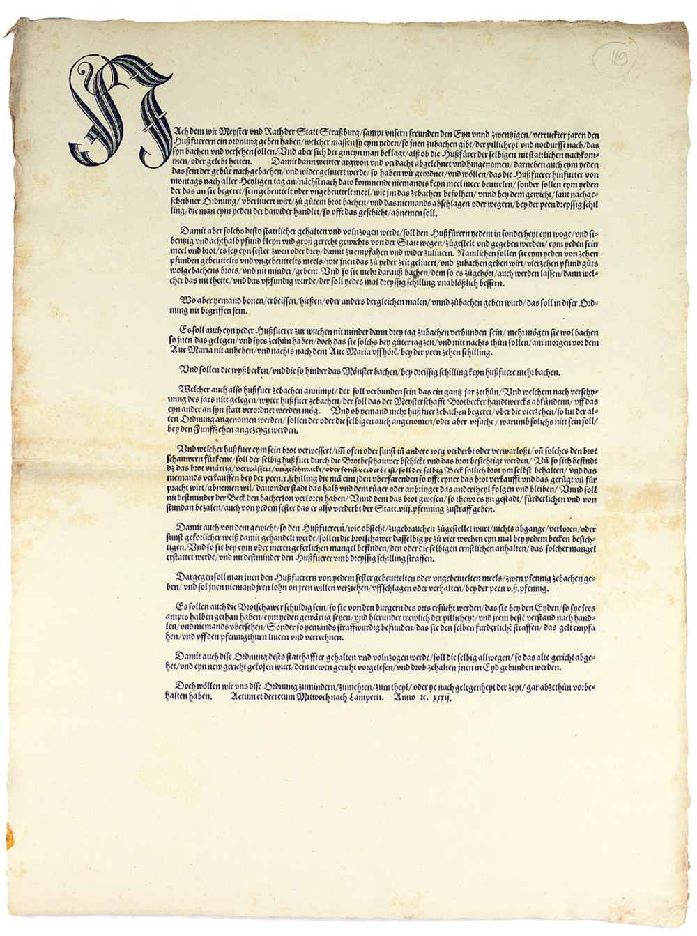 Rarissime ordonnance du Conseil de la ville libre impériale de Strasbourg relative aux Huffierer, c’est-à-dire aux boulangers cuisant le pain pour autrui à partir de la farine apportée par les habitants. Le texte, motivé par des plaintes sur le non-respect d’une ordonnance antérieure, vise à rétablir la confiance du public et à garantir que chacun reçoive son pain « selon le poids dû ». L’ordonnance précise avec minutie les modalités de ce service : obligation pour les boulangers d’accepter la farine remise par les particuliers (tamisée ou non), remise d’un poids réglementaire de pain – quatorze livres de bon pain pour chaque unité de farine – et utilisation de balances et poids étalonnés fournis par la ville. Elle fixe également les jours et horaires de cuisson (au moins trois jours par semaine, uniquement de jour, entre les deux Ave Maria), les conditions d’exercice du métier (engagement annuel des boulangers et encadrement par la corporation), ainsi que les rémunérations autorisées pour la cuisson. Le texte organise en outre un système de contrôle municipal étroit : les Brotschauer (inspecteurs du pain) doivent vérifier régulièrement les poids et la qualité du pain, examiner les plaintes et faire sanctionner les boulangers dont la production serait jugée défectueuse (pain brûlé, mal cuit, altéré ou impropre à la consommation). Les infractions sont punies d’amendes, dont une partie revient à la ville et une autre au dénonciateur. L’ordonnance prévoit encore la lecture publique du règlement à chaque renouvellement du tribunal urbain, afin d’assurer son application continue, tout en réservant au Conseil le droit d’en modifier les dispositions si les circonstances l’exigent. La date figure à la fin du texte : “Actum et decretum Mittwoch nach Lamperti. Anno etc. xxxii.” soit le mercredi suivant la Saint-Lambert (17 septembre), correspondant au 20 septembre 1532. Destinés à être affichés publiquement, les placards municipaux de ce type ont rarement été conservés ; ils constituent aujourd’hui des témoignages précieux de la réglementation des métiers, du contrôle des denrées alimentaires et du fonctionnement des institutions urbaines dans les villes du Saint-Empire au XVIe siècle. Transcription (respect de l’orthographe originale) et traduction française intégrale disponibles sur demande. Quelques rousseurs, pli central mais très bel état de conservation.