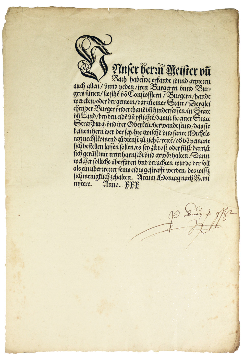 Placard imprimé émanant du Magistrat de la ville libre impériale de Strasbourg et publiant une ordonnance adressée à l’ensemble des bourgeois, fils de bourgeois, artisans et habitants dépendant de la cité. Le texte, composé en allemand de chancellerie du début du XVIe siècle et imprimé en caractères gothiques, s’ouvre par la formule solennelle « Unser herrn Meister vnnd Rath habendt erkandt vnnd gepieten », par laquelle les maîtres et le Conseil de la ville déclarent avoir statué et ordonné la mesure qui suit. L’ordonnance prescrit à tous les citoyens liés à la ville par leur serment civique de ne se mettre au service d’aucun seigneur étranger et de ne s’engager ni à cheval ni à pied au service d’autrui pendant la période indiquée. Elle rappelle expressément que ces habitants sont liés par leur serment à la ville de Strasbourg et à son autorité et qu’ils doivent par conséquent se tenir prêts, armés et équipés, pour le service de la cité elle-même. Quiconque enfreindrait cette interdiction s’exposerait à être puni comme violateur de son serment. L’acte est daté selon l’usage administratif de l’époque « Montag nach Reminiscere. Anno XXX », c’est-à-dire le lundi suivant le deuxième dimanche du Carême de l’année 1530. Cette date correspond à un moment particulièrement sensible pour Strasbourg et pour l’Empire. La ville, engagée depuis plusieurs années dans le mouvement de la Réforme, se trouve alors au cœur des tensions religieuses et politiques qui culminent lors de la Diète d’Augsbourg. Dans ce contexte d’incertitude, les autorités urbaines veillent à conserver sous leur contrôle la force militaire disponible. Les villes impériales de la vallée du Rhin devaient en effet composer avec un phénomène largement répandu, celui du service mercenaire, qui attirait de nombreux hommes vers les armées princières. En interdisant à ses habitants de s’engager au service d’un seigneur et en leur ordonnant de conserver leurs armes prêtes, le Conseil de Strasbourg affirme à la fois son autorité sur les citoyens liés par le serment de bourgeoisie et sa volonté de préserver la capacité de défense de la communauté urbaine. Ce document constitue ainsi un témoignage direct et particulièrement évocateur des mécanismes de gouvernement et de discipline civique dans une grande ville impériale au moment charnière de la Réforme. Transcription (respect de l’orthographe originale) et traduction française intégrale disponibles sur demande. Mention autographe : « p. Burger und Rath » (per Burger und Rath, « par les bourgeois et le Conseil »), avec paraphe. Très bel état.