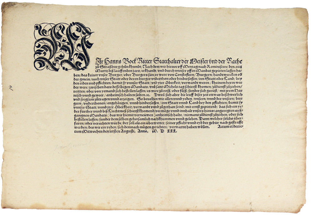 Strasbourg, s.e., 1530 ; 23,3 x 34,5 cm, 1 feuillet imprimé en caractères gothiques, orné d’une grande lettrine en tête.