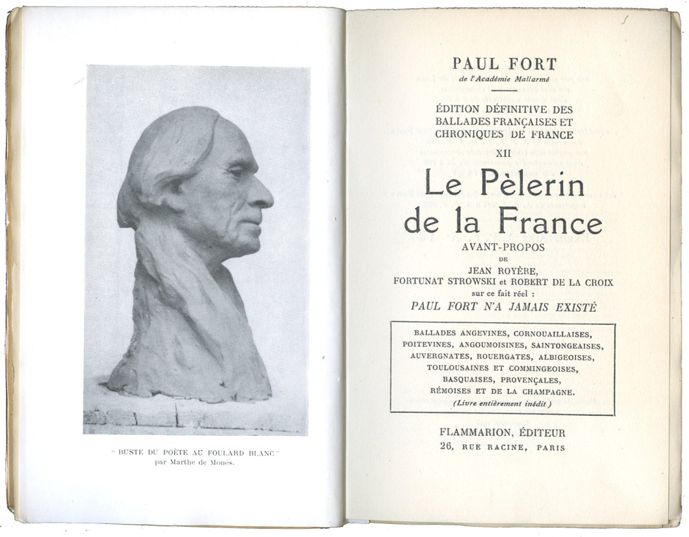 Édition définitive, en partie originale, constituant le tome XII des Ballades françaises et Chroniques de France. Un des 633 exemplaires numérotés sur pur fil, pour le "Groupe des Amis de Paul Fort", comportant un envoi autographe signé de l'auteur à Anne-Rose Hirsch, et une citation autographe au verso, monogrammée. Le sous-titre porte : Ballades angevines, cornouaillaises, poitevines, angoumoisines, saintongeaises, auvergnates, rouergates, albigeoises, toulousaines et commingeoises, basquaises, provençales, rémoises et de la Champagne (livres entièrement inédits). Minimes décharges brunes sur les pages de garde, sinon très bel exemplaire.