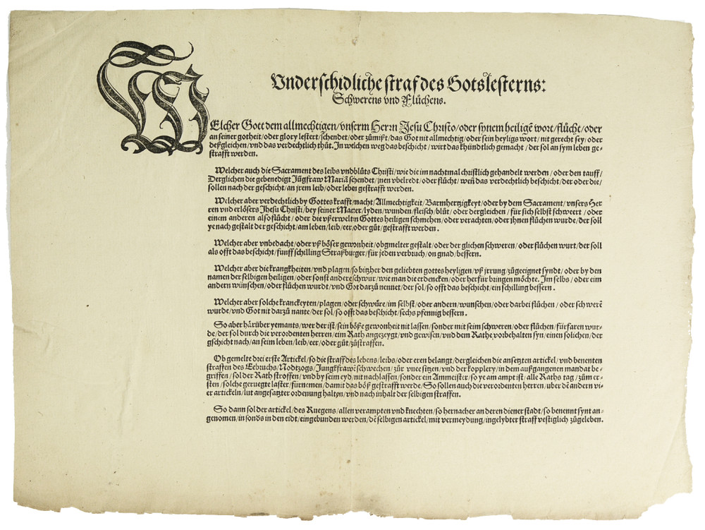 Placard imprimé, intitulé « Unterschiedliche Straf des Gotteslästerns, schweren und fluchen » (« Différentes peines du blasphème : jurons et malédictions »). Ce document énonce un ensemble de dispositions pénales relatives au blasphème, aux jurons et à la profanation des choses sacrées. Il s’inscrit pleinement dans le contexte de la Réforme protestante, période de profond renouvellement religieux marquée par un renforcement notable de la discipline morale au sein des villes du Saint-Empire. Le texte témoigne de la sévérité des sanctions encourues, qui s’échelonnent de l’amende à la peine capitale dans les cas les plus graves, notamment en matière d’atteinte aux sacrements ou à la personne du Christ. L’ordonnance distingue avec précision plusieurs degrés de culpabilité — blasphème délibéré, habitude coupable, infractions aggravées — chacun faisant l’objet d’une gradation des peines conforme à sa gravité. Transcription (respect de l’orthographe originale) et traduction française intégrale disponibles sur demande. Petite déchirure (env. 2 cm), pli central ; bon état de conservation.