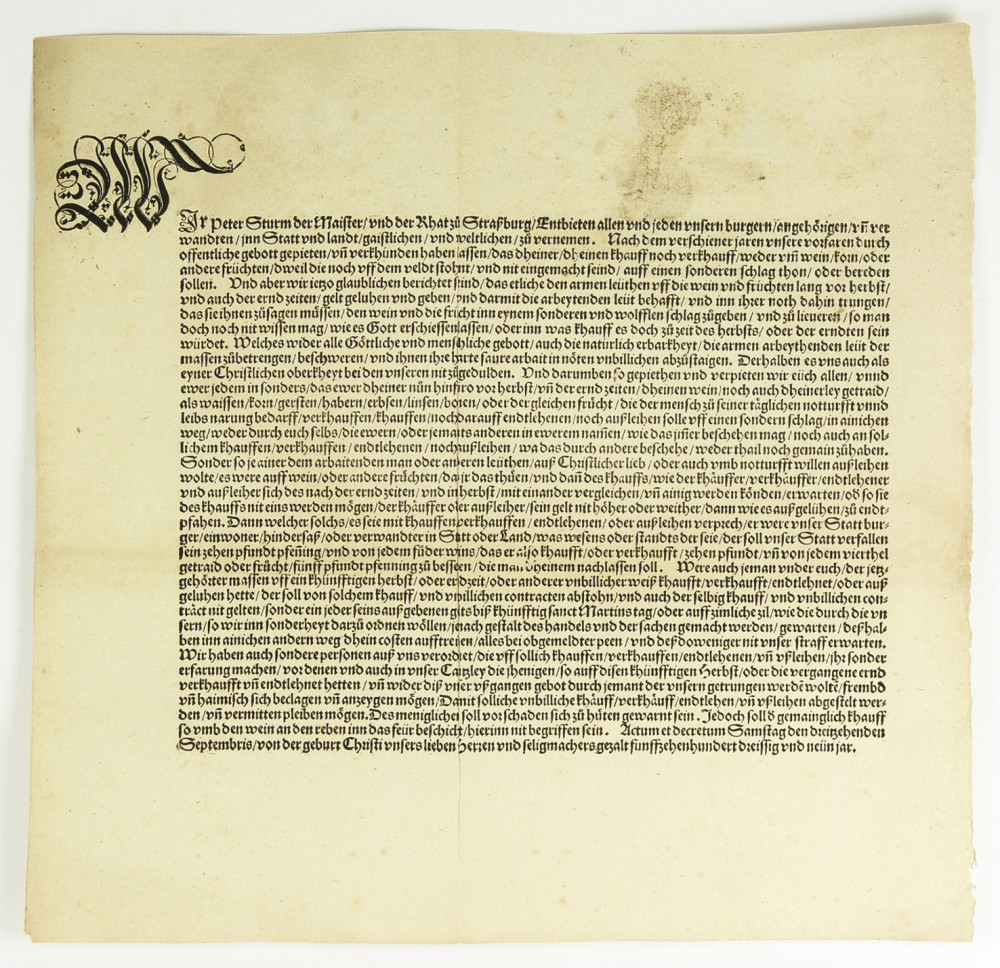 Placard émanant du Stettmeister Peter Sturm et du Conseil de la ville, relatif à l’interdiction des ventes anticipées de récoltes sur pied. Le texte proscrit explicitement les pratiques de crédit abusif par lesquelles des intermédiaires avançaient des fonds aux travailleurs agricoles afin de les contraindre à céder leurs productions — vin, céréales et autres « fruits de la terre », c’est-à-dire l’ensemble des récoltes agricoles — à vil prix avant la récolte. L’ordonnance stigmatise ces usages comme contraires à la loi divine, à l’ordre humain et à l’équité naturelle, révélant la dimension morale qui sous-tend la régulation économique à l’époque moderne. Ce document constitue un témoignage particulièrement significatif de la lutte contre la spéculation sur les denrées agricoles et contre les formes d’usure déguisée dans les villes du Saint-Empire au XVIe siècle. Il illustre également le rôle actif des autorités urbaines dans la protection des producteurs et l’encadrement des marchés, dans une ville majeure comme Strasbourg. Transcription (respect de l’orthographe originale) et traduction française intégrale disponibles sur demande. Petites brunissures sans gravité ; très bon état.
