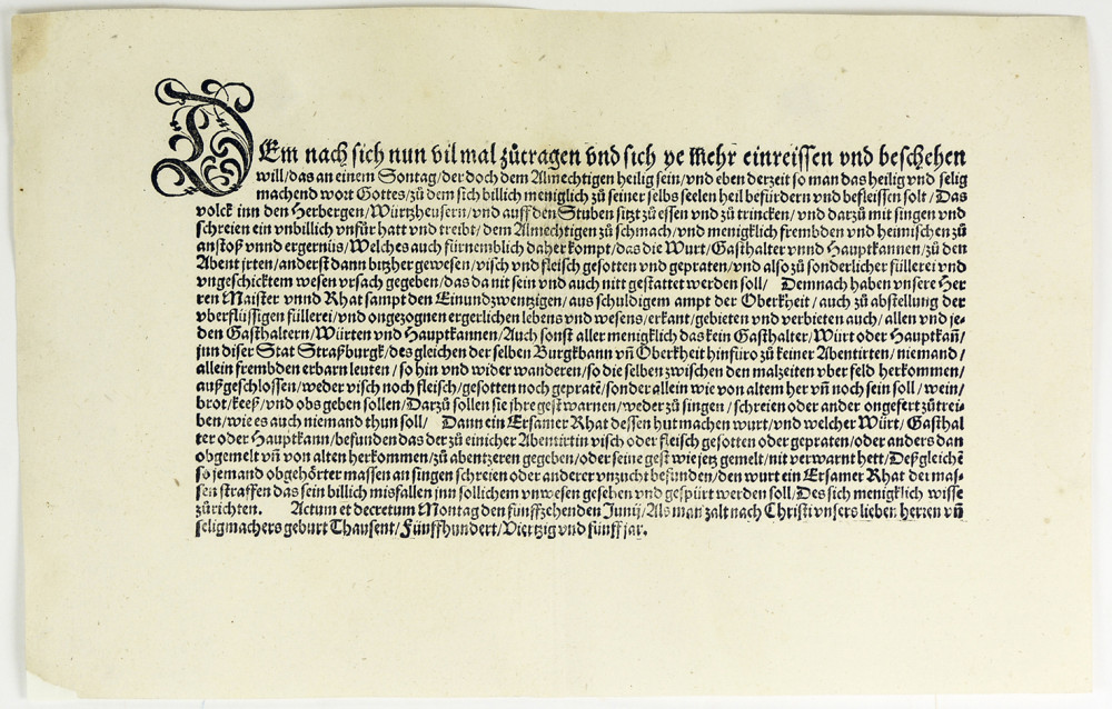 Placard émanant du Stettmeister et du Conseil de la Ville de Strasbourg, visant à encadrer les pratiques collectives les dimanches et jours de fête, en particulier durant le temps des offices religieux. Le texte dénonce les rassemblements dans les auberges, où se développent ivrognerie, chants et désordres jugés offensants envers Dieu et scandaleux pour la communauté, détournant les fidèles de l’écoute de la parole divine. Il incrimine directement les aubergistes et maîtres de maison, accusés de favoriser ces pratiques. L’ordonnance interdit en conséquence le service de repas chauds (viande et poisson) le soir, sauf pour les voyageurs de passage, limitant ainsi l’attractivité des tavernes, qui ne peuvent désormais servir que vin, pain et fromage. Elle impose également une stricte discipline des comportements (interdiction de chanter, crier ou troubler l’ordre), assortie de sanctions destinées à en assurer l’exécution. Transcription (respect de l’orthographe originale) et traduction française intégrale disponibles sur demande. Très bel état.