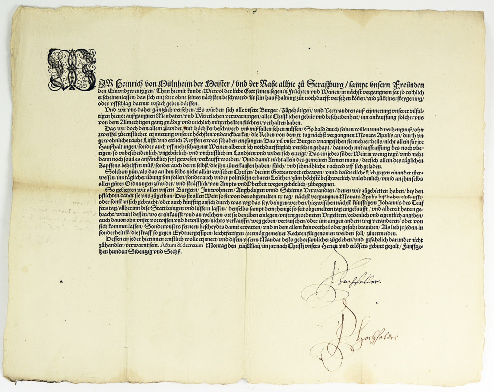 Placard émanant du Stettmeister Heinrich von Müllenheim et du Conseil de la Ville de Strasbourg, relatif à la régulation du commerce du vin dans un contexte de perturbations des récoltes. Le texte s’inscrit dans une situation de tension consécutive à des gelées printanières ayant affecté la production, entraînant des achats précoces et des phénomènes d’accaparement. Il dénonce ces pratiques, responsables d’une hausse rapide des prix et préjudiciables aux populations les plus modestes. L’ordonnance interdit en conséquence l’introduction, la circulation et la revente de vin acquis depuis le mois d’avril, jusqu’à la fête de la Saint-Jean-Baptiste, afin de contenir la spéculation et de stabiliser le marché. Elle illustre l’intervention des autorités urbaines dans la régulation des denrées essentielles et la prévention des désordres économiques. Exemplaire portant, au bas à droite, deux grandes signatures manuscrites anciennes, sans identification certaine. Transcription (respect de l’orthographe originale) et traduction française intégrale disponibles sur demande. Très bel état.