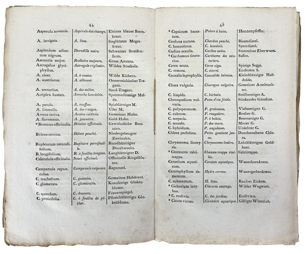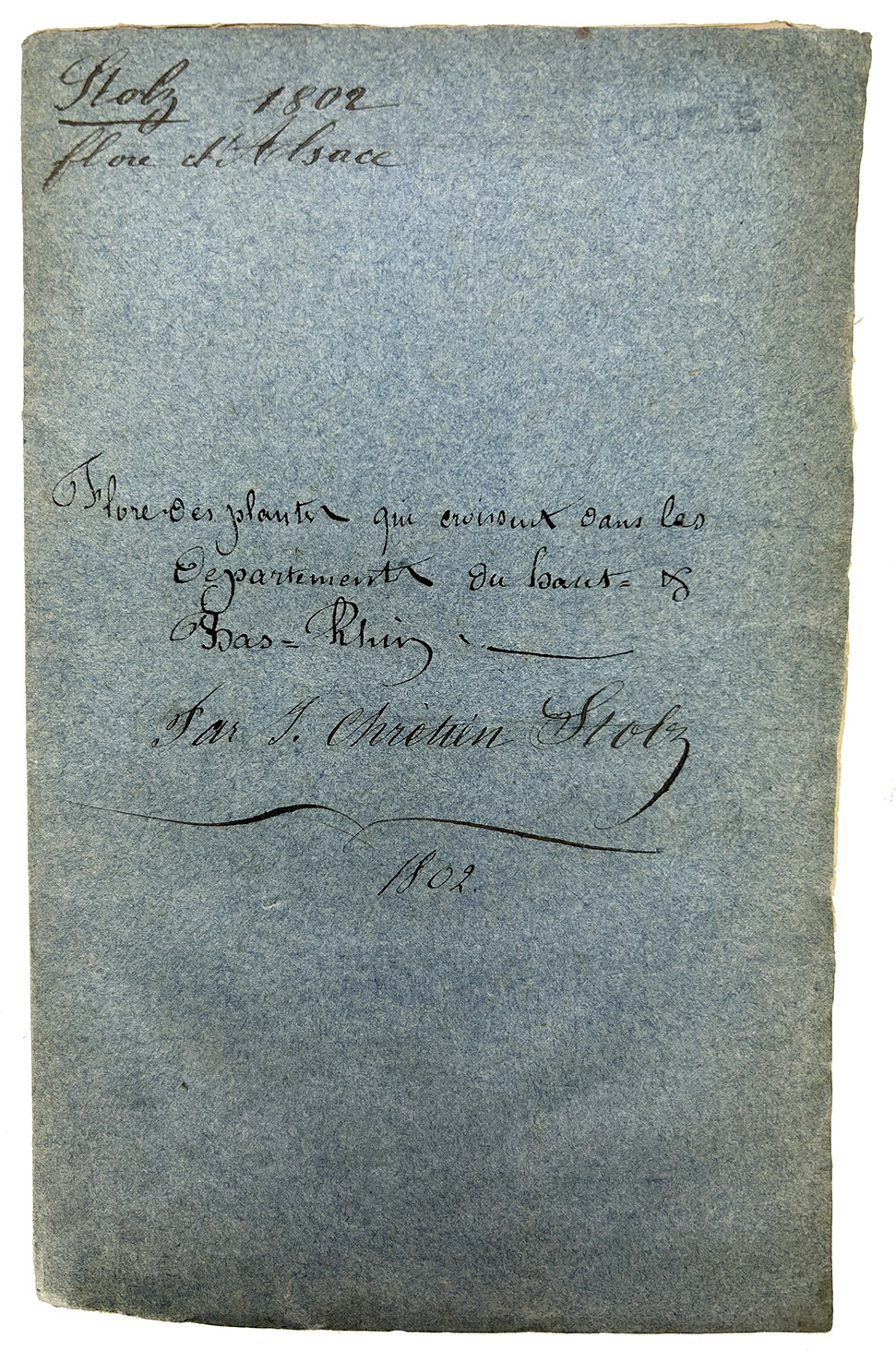 Édition originale et unique, répertoriant près de 1600 plantes, décrites en trois colonnes par nom latin, français et allemand. La préface précise : "L'auteur, qui a habité successivement plusieurs parties des deux départements du Rhin, a cherché constamment à profiter de chaque occasion pour ajouter à l'exactitude de ses recherches : des excursions fréquentes, et souvent fort longues, dans la plaine ou dans les montagnes ; un commerce suivi avec un grand nombre de cultivateurs distingués, et avec la plupart de ceux de nos compatriotes qui se livrent à l'étude de la botanique ; mais surtout une correspondance soigneusement entretenue pendant une longue suite d'années d'années avec le Professeur Hermann et son digne fils (…). Puisse cette Flore, en mettant nos richesses végétales sous les yeux des amateurs des deux départements du Rhin, les encourager à exploiter les sites si variés de nos contrées; à parcourir nos vallées, nos montagnes, les environs surtout du Ballon, où l'auteur a fait des moissons abondantes, mais où les botanistes trouveront encore beaucoup à récolter”. Provenance : Museum d’histoire naturelle Durand-Cosson ; cachets de collection et tampon “double” signalant un exemplaire remis en circulation. Petite cerne d'humidité en pied de quelques feuillets, sans atteinte au texte ; bel exemplaire par ailleurs, non rogné, tel que paru.