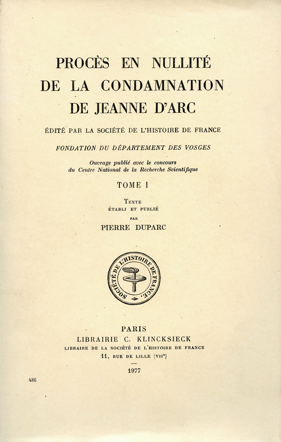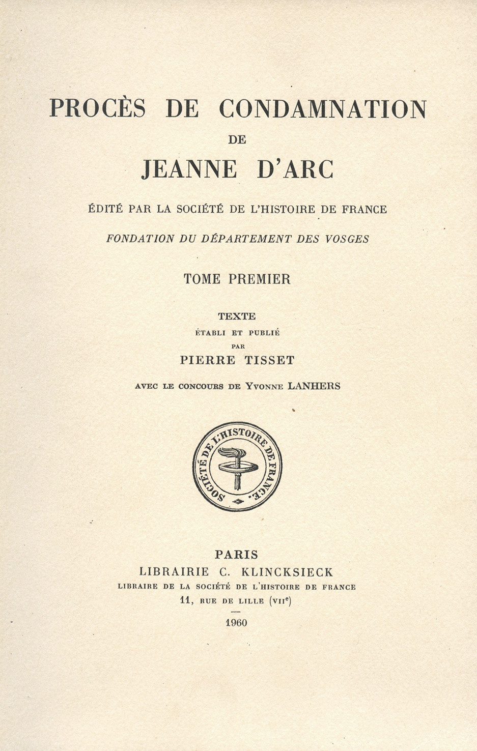 Édition critique monumentale publiée par la Société de l’Histoire de France, réunissant l’ensemble des sources relatives aux deux procédures judiciaires intentées contre Jeanne d’Arc : le procès de condamnation (1431) et le procès en nullité ou de réhabilitation (1455–1456). Le procès de condamnation est édité par Pierre Tisset, avec le concours d’Yvonne Lanhers (3 vol., 1960–1971), le troisième volume contenant notamment une introduction générale de Tisset ainsi qu’un index des noms de personnes et de lieux. Le procès en nullité est établi par Pierre Duparc (5 vol., 1977–1988), avec le soutien de la Fondation du département des Vosges et du Centre national de la recherche scientifique. Fondée sur la collation des manuscrits et accompagnée d’une traduction française, d’introductions et de notes, cette édition remplace les grandes compilations du XIXe siècle, au premier rang desquelles celle de Jules Quicherat (Procès de condamnation et de réhabilitation de Jeanne d’Arc, 1841–1849), dont elle propose une révision critique conforme aux méthodes de l’érudition moderne (cf. Société de l’Histoire de France ; Annales de Normandie, 2012/2, p. 253). "L'édition de M. Pierre Tisset est techniquement d'une commodité, d'une clarté et d'une exactitude exemplaires (…). L'impression à laquelle personne n'échappera en lisant ces pages, c'est l'immense grandeur de cette fille des champs dominant de sa vive intelligence, de sa droiture, de sa pureté, de sa flamme patriotique un maquis de chats fourrés retors et perfides. C'est un des spectacles sublimes de l'humanité" (Pocquet du Haut-Jusse, Bibliothèque de l'École des chartes, 1961, pp. 284-287). Le tome Ier comporte des fac-similés des manuscrits du procès de condamnation. Bel ensemble, bien conservé, dont les exemplaires sont en grande partie non coupés.