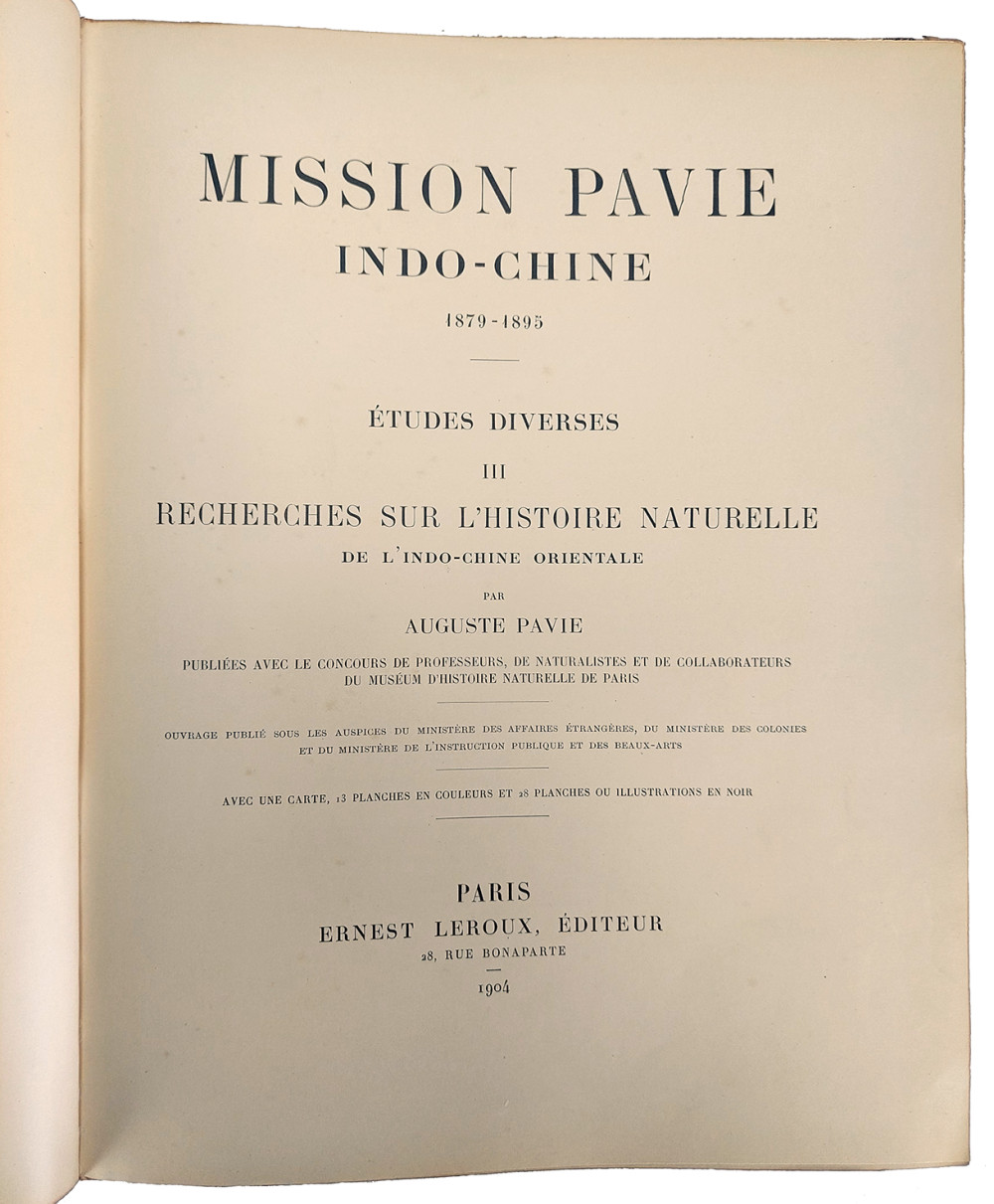 Mission Pavie Indo-Chine. 1879-1895. Études diverses. III. Recherches sur l'histoire naturelle de l'Indo-Chine naturelle. Avec une carte, 13 planches en couleurs et 28 planches ou illustrations en noir.