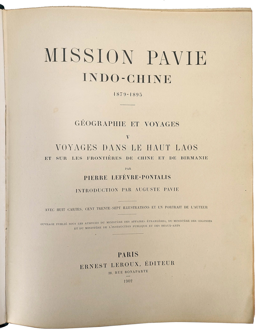 Mission Pavie Indo-Chine. 1879-1895. Géographie et voyages. V. Voyages dans le Haut Laos et sur les frontières de Chine et de Birmanie. Introduction par Auguste Pavie. Avec huit cartes, cent trente-sept illustrations et un portrait de l'auteur.