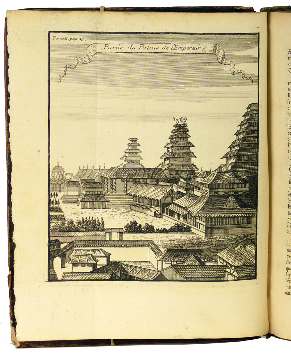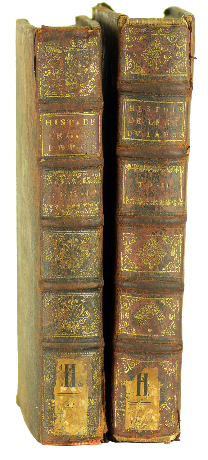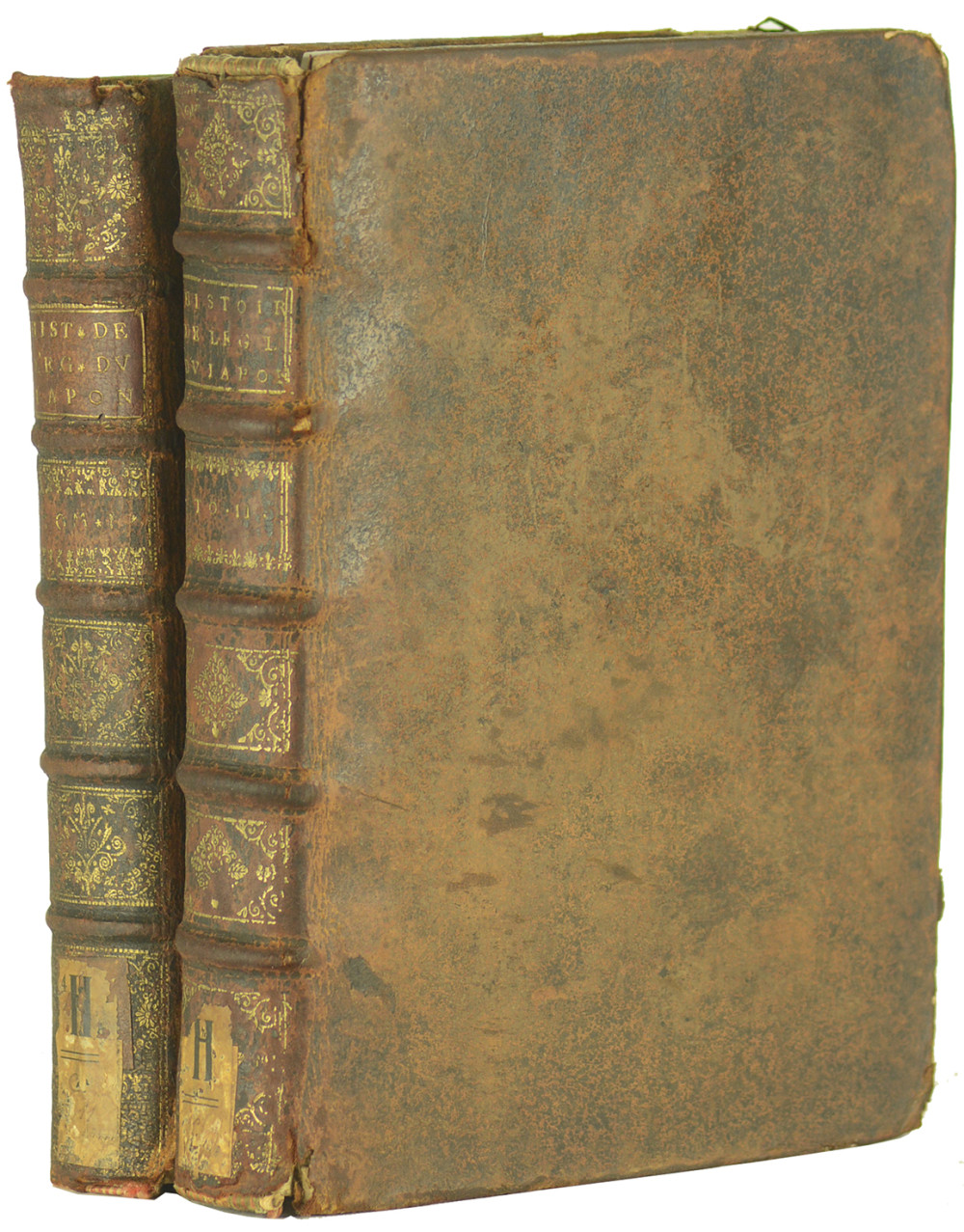 Cordier, Bibliotheca Japonica 400. Édition originale rare, publiée anonymement, de cet important ouvrage sur la mission jésuite au Japon, depuis l'arrivée de Saint François Xavier en 1546, jusqu'en 1650. "Cet ouvrage, qui a été traduit en anglais en 1707, puis en italien et en portugais, est tiré en grande partie de celui que le R.P. Solier, jésuite, avait publié en 1627. Crasset le mit dans un meilleur ordre, en retoucha le style, et y ajouta une continuation, depuis 1624 jusqu'à 1658. Le deuxième volume est entièrement consacré à l'histoire de la cruelle persécution commencée en 1597, et dont l'historien attribue en grande partie la rigueur à l'imprudence des missionnaires dominicains et franciscains, qui ne prenaient aucune précaution pour dérober aux regards des infidèles leurs cérémonies religieuses" (Michaud. T. 9, p. 442). L'ouvrage est illustré de huit gravures sur cuivre représentant des scènes de torture, mais aussi le palais de l'Empereur et les costumes de nobles japonais. Une partie de la planche représentant le trône de l'Empereur est malheureusement amputée de la partie dépliante, et de petits manques sont à déplorer sur une planche de costumes. Cachets de bibliothèque sur les pages de garde et de titre. Exemplaires corrects malgré les défauts signalés.
